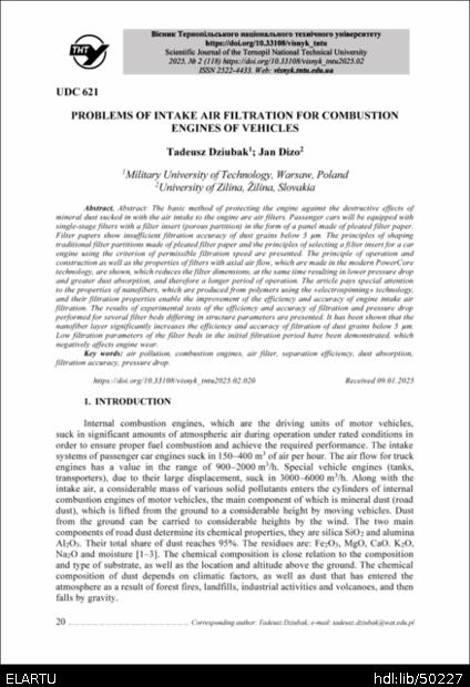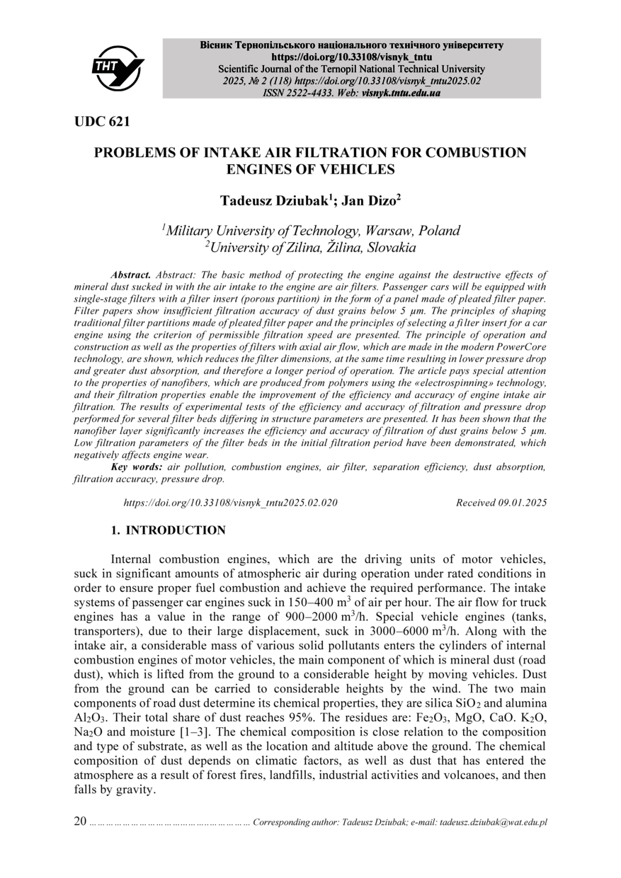 | Bibliographic citation (APA): | Dziubak, T., & Dizo, J. (2025). Problems of intake air filtration for combustion engines of vehicles. Scientific journal of the ternopil national technical university, 118(2), 20-41. TNTU.. |
