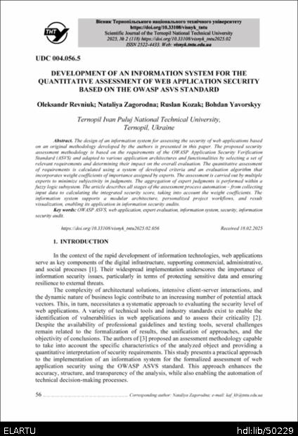 | Bibliographic citation (APA): | Revniuk, O., Zagorodna, N., Kozak, R., & Yavorskyy, B. (2025). Development of an information system for the quantitative assessment of web application security based on the OWASP ASVS standard. Scientific journal of the ternopil national technical university, 118(2), 56-65. TNTU.. |