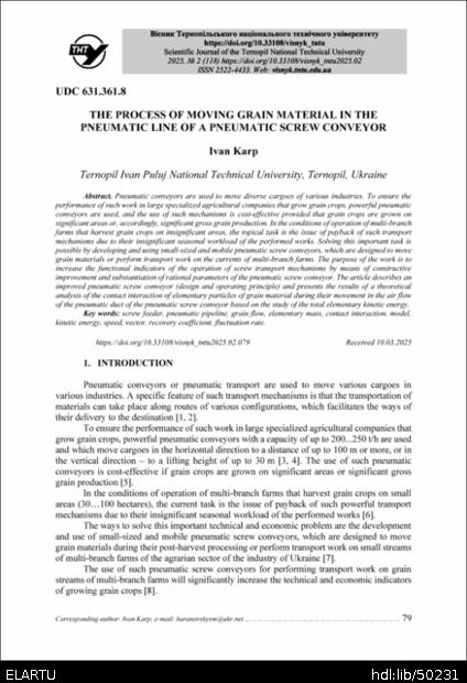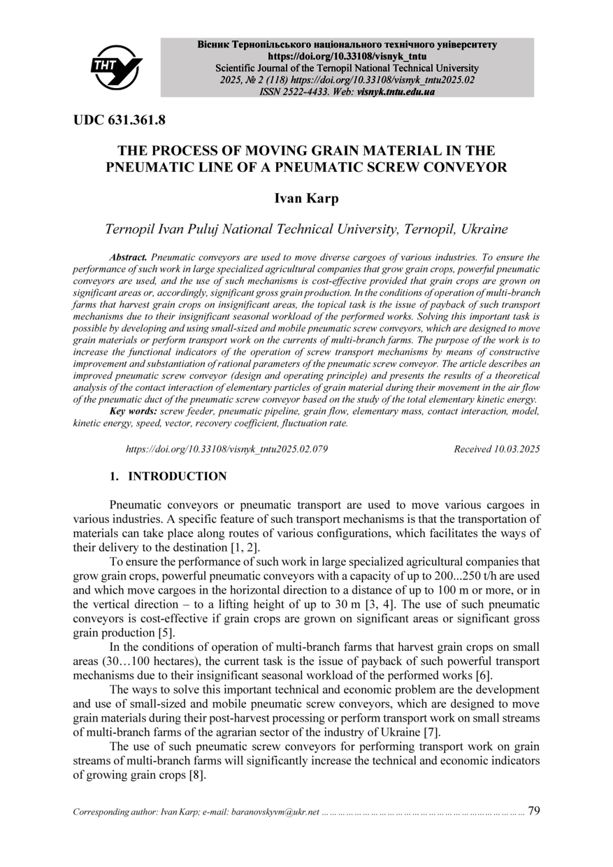 | Bibliographic citation (APA): | Karp, I. (2025). The process of moving grain material in the pneumatic line of a pneumatic screw conveyor. Scientific journal of the ternopil national technical university, 118(2), 79-90. TNTU.. |