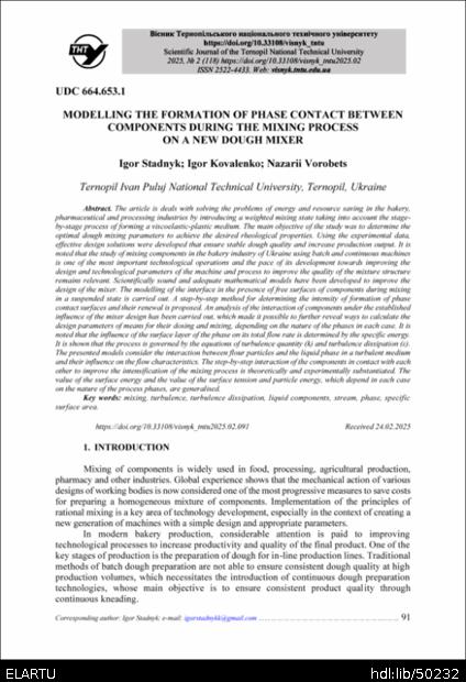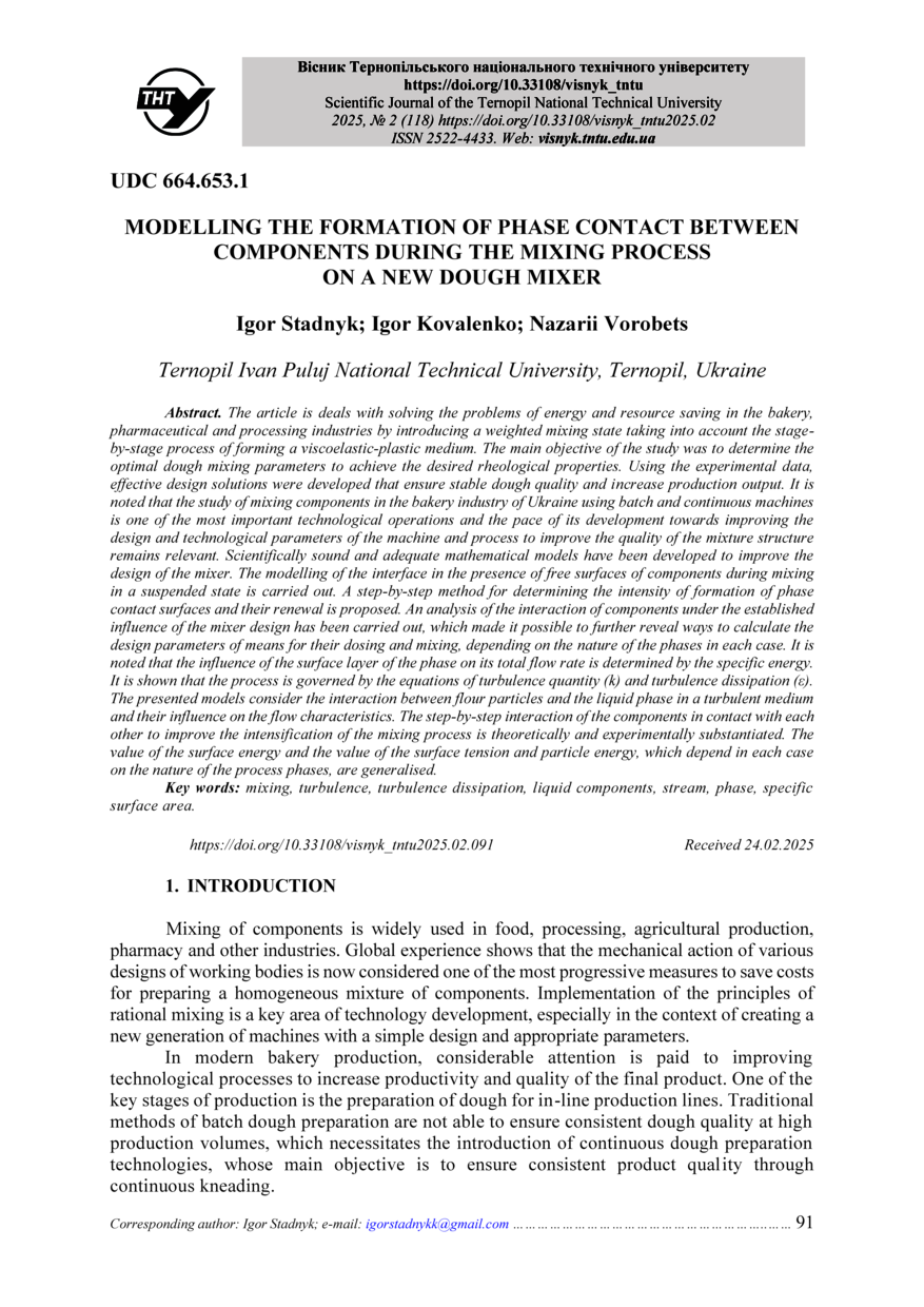 | Bibliographic citation (APA): | Stadnyk, I., Kovalenko, I., & Vorobets, N. (2025). Modelling the formation of phase contact between components during the mixing process on a new dough mixer. Scientific journal of the ternopil national technical university, 118(2), 91-99. TNTU.. |