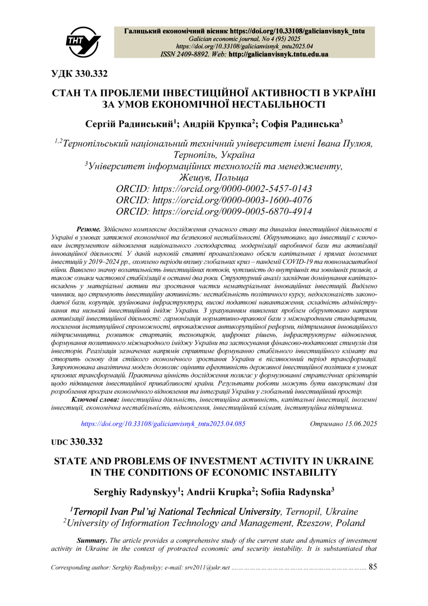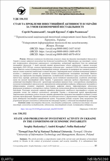 | Bibliographic citation (APA): | Radynskyy, S., Krupka, A., & Radynska, S. (2025). Stan ta problemy investytsiinoi aktyvnosti v Ukraini za umov ekonomichnoi nestabilnosti [State and problems of investment activity in Ukraine in the conditions of economic instability]. Galician economic journal, 95(4), 85-94. TNTU. [in Ukrainian]. |