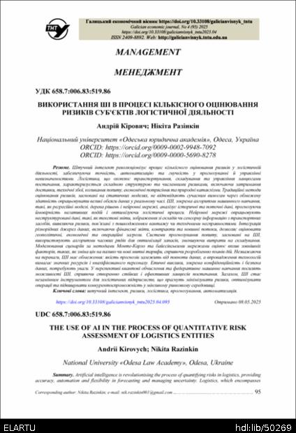 | Bibliographic citation (APA): | Kirovych, A., & Razinkin, N. (2025). Vykorystannia ShI v protsesi kilkisnoho otsiniuvannia ryzykiv subʼiektiv lohistychnoi diialnosti [The use of AI in the process of quantitative risk assessment of logistics entities]. Galician economic journal, 95(4), 95-104. TNTU. [in Ukrainian]. |