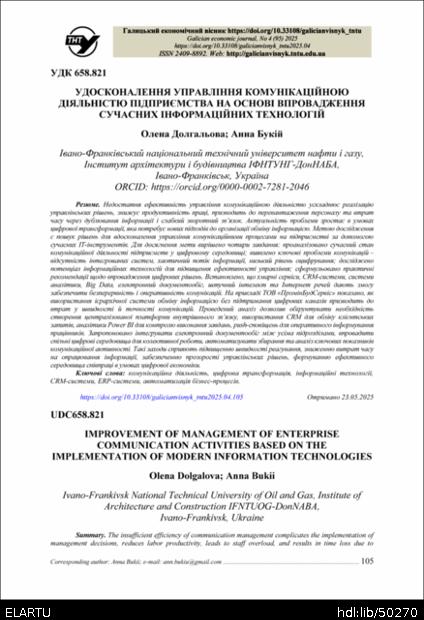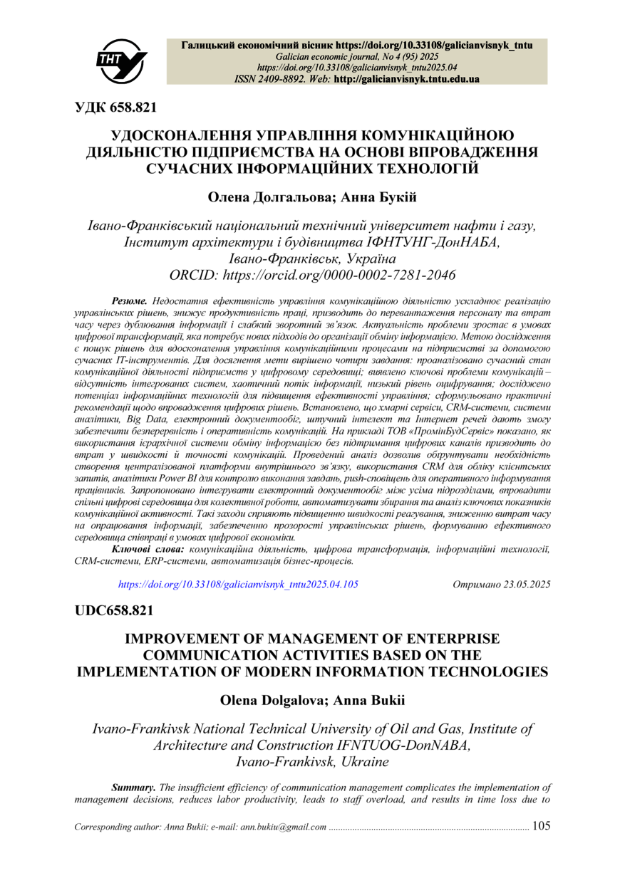 | Bibliographic citation (APA): | Dolgalova, O., & Bukii, A. (2025). Udoskonalennia upravlinnia komunikatsiinoiu diialnistiu pidpryiemstva na osnovi vprovadzhennia suchasnykh informatsiinykh tekhnolohii [Improvement of management of enterprise communication activities based on the implementation of modern information technologies]. Galician economic journal, 95(4), 105-113. TNTU. [in Ukrainian]. |
