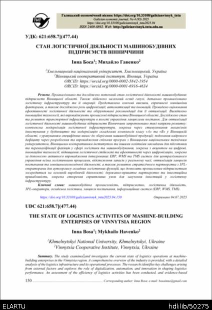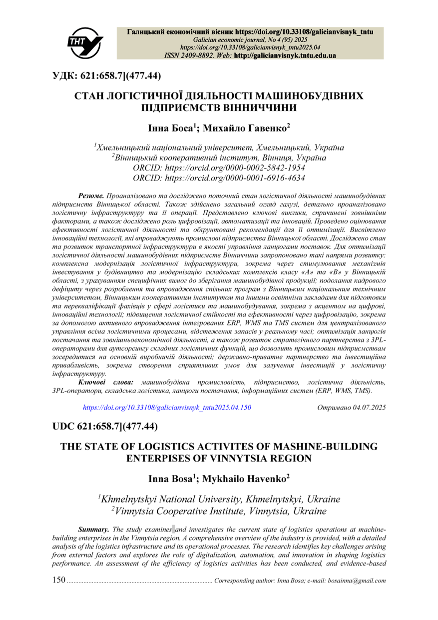 | Bibliographic citation (APA): | Bosa, I., & Havenko, M. (2025). Stan lohistychnoi diialnosti mashynobudivnykh pidpryiemstv vinnychchyny [The state of logistics activites of mashine-building enterpises of vinnytsia region]. Galician economic journal, 95(4), 150-162. TNTU. [in Ukrainian]. |