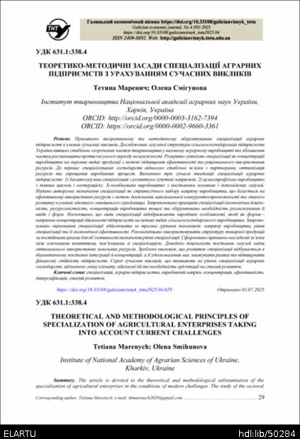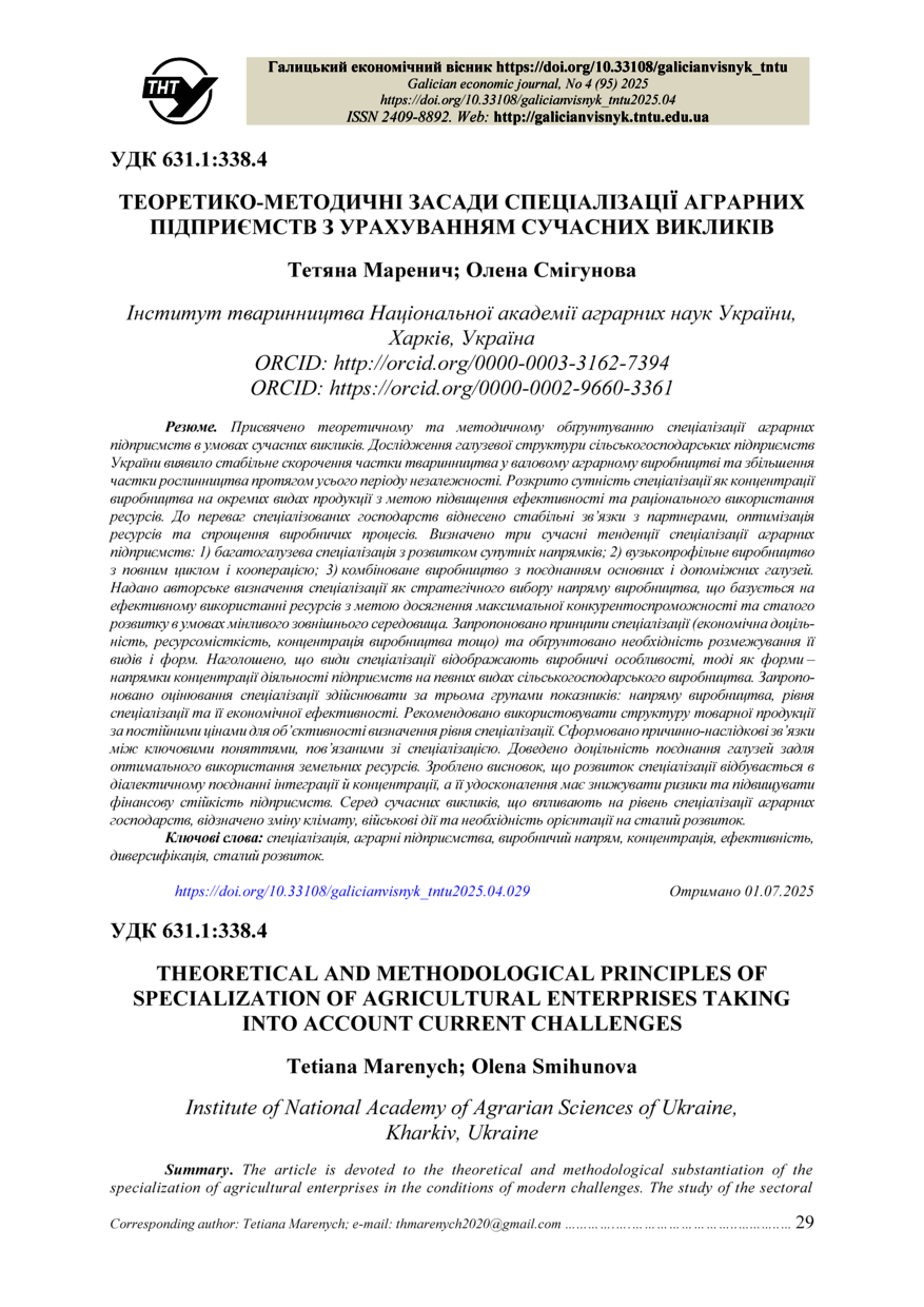 | Bibliographic citation (APA): | Marenych, T., & Smihunova, O. (2025). Teoretyko-metodychni zasady spetsializatsii ahrarnykh pidpryiemstv z urakhuvanniam suchasnykh vyklykiv [Theoretical and methodological principles of specialization of agricultural enterprises taking into account current challenges]. Galician economic journal, 95(4), 29-42. TNTU. [in Ukrainian]. |