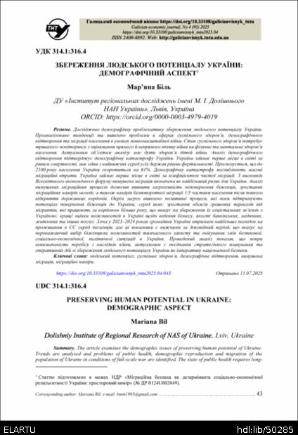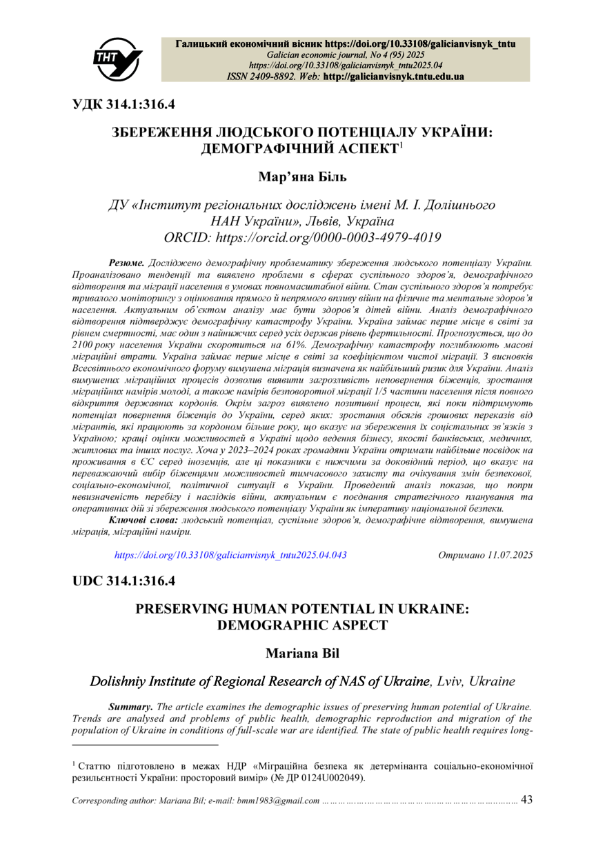 | Bibliographic citation (APA): | Bil, M. (2025). Zberezhennia liudskoho potentsialu Ukrainy: demohrafichnyi aspekt [Preserving human potential in Ukraine: demographic aspect]. Galician economic journal, 95(4), 43-53. TNTU. [in Ukrainian]. |