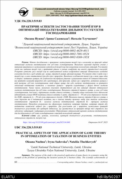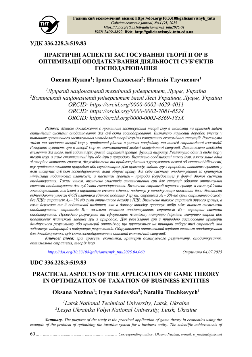 | Bibliographic citation (APA): | Nuzhna, O., Sadovska, I., & Tluchkevych, N. (2025). Praktychni aspekty zastosuvannia teorii ihor v optymizatsii opodatkuvannia diialnosti subiektiv hospodariuvannia [Practical aspects of the application of game theory in optimization of taxation of business entities]. Galician economic journal, 95(4), 60-65. TNTU. [in Ukrainian]. |