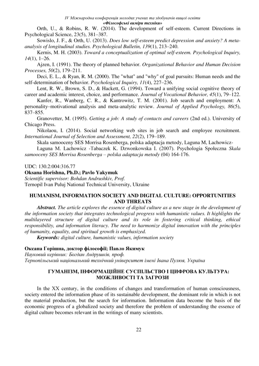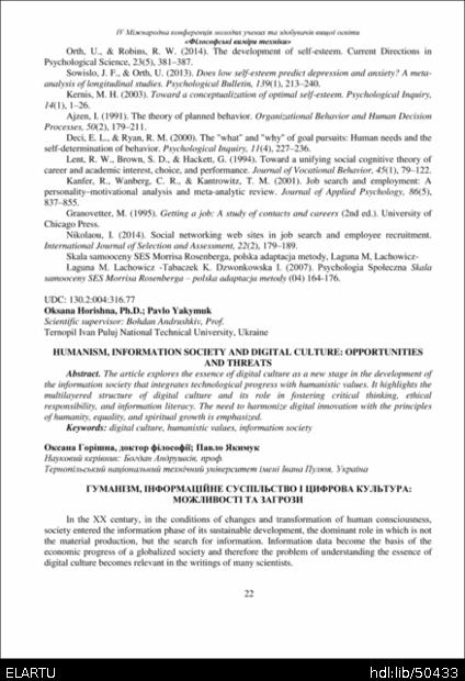 | Bibliographic citation (APA): | Horishna, O., & Yakymuk, P. (2025). Humanism, information society and digital culture: opportunities and threats. Book of abstracts of the Ⅳ International Conference of Young Scholars and Higher Education Applicants „Philosophical dimensions of technology“, 26 November 2025, Ternopil, 22-24. PE Palianytsia V.A... |