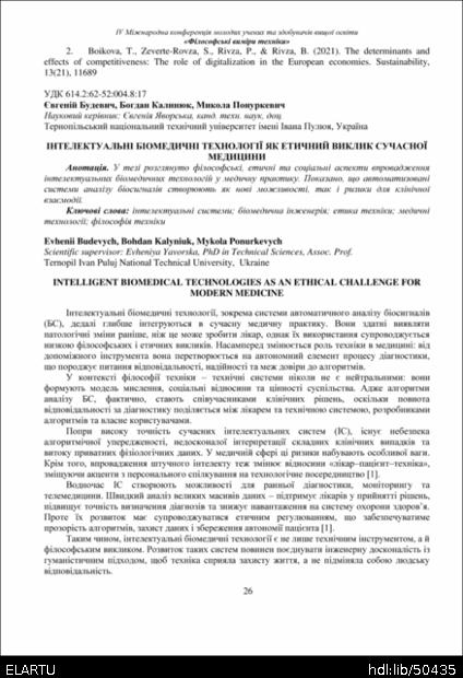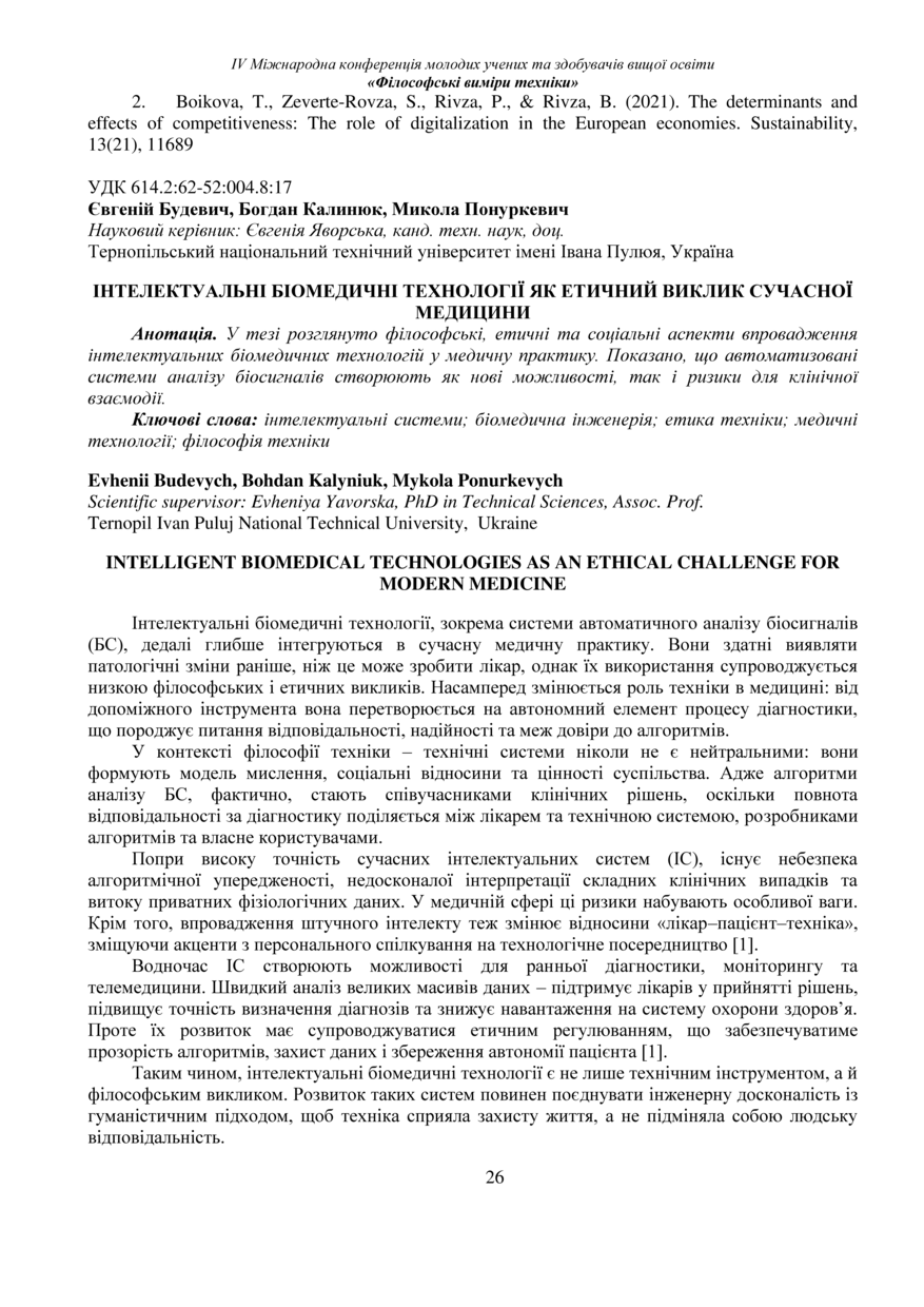 | Bibliographic citation (APA): | Budevych, E., Kalyniuk, B., & Ponurkevych, M. (2025). Intelektualni biomedychni tekhnolohii yak etychnyi vyklyk suchasnoi medytsyny [Intelligent biomedical technologies as an ethical challenge for modern medicine]. Book of abstracts of the Ⅳ International Conference of Young Scholars and Higher Education Applicants „Philosophical dimensions of technology“, 26 November 2025, Ternopil, 26-27. PE Palianytsia V.A.. [in Ukrainian]. |