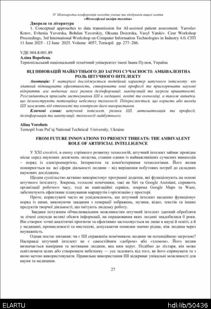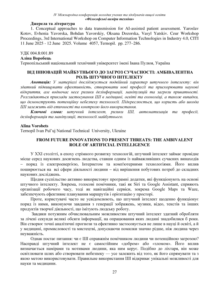 | Bibliographic citation (APA): | Vorobets, A. (2025). Vid innovatsii maibutnoho do zahroz suchasnosti: ambivalentna rol shtuchnoho intelektu [From future innovations to present threats: the ambivalent role of artificial intelligence]. Book of abstracts of the Ⅳ International Conference of Young Scholars and Higher Education Applicants „Philosophical dimensions of technology“, 26 November 2025, Ternopil, 27-29. PE Palianytsia V.A.. [in Ukrainian]. |