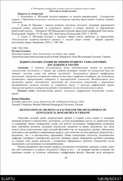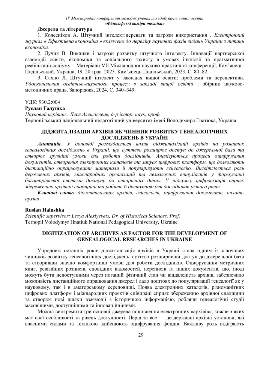 | Bibliographic citation (APA): | Halushka, R. (2025). Didzhytalizatsiia arkhiviv yak chynnyk rozvytku henealohichnykh doslidzhen v Ukraini [Digitization of archives as factor for the development of genealogical researches in Ukraine]. Book of abstracts of the Ⅳ International Conference of Young Scholars and Higher Education Applicants „Philosophical dimensions of technology“, 26 November 2025, Ternopil, 29-31. PE Palianytsia V.A.. [in Ukrainian]. |