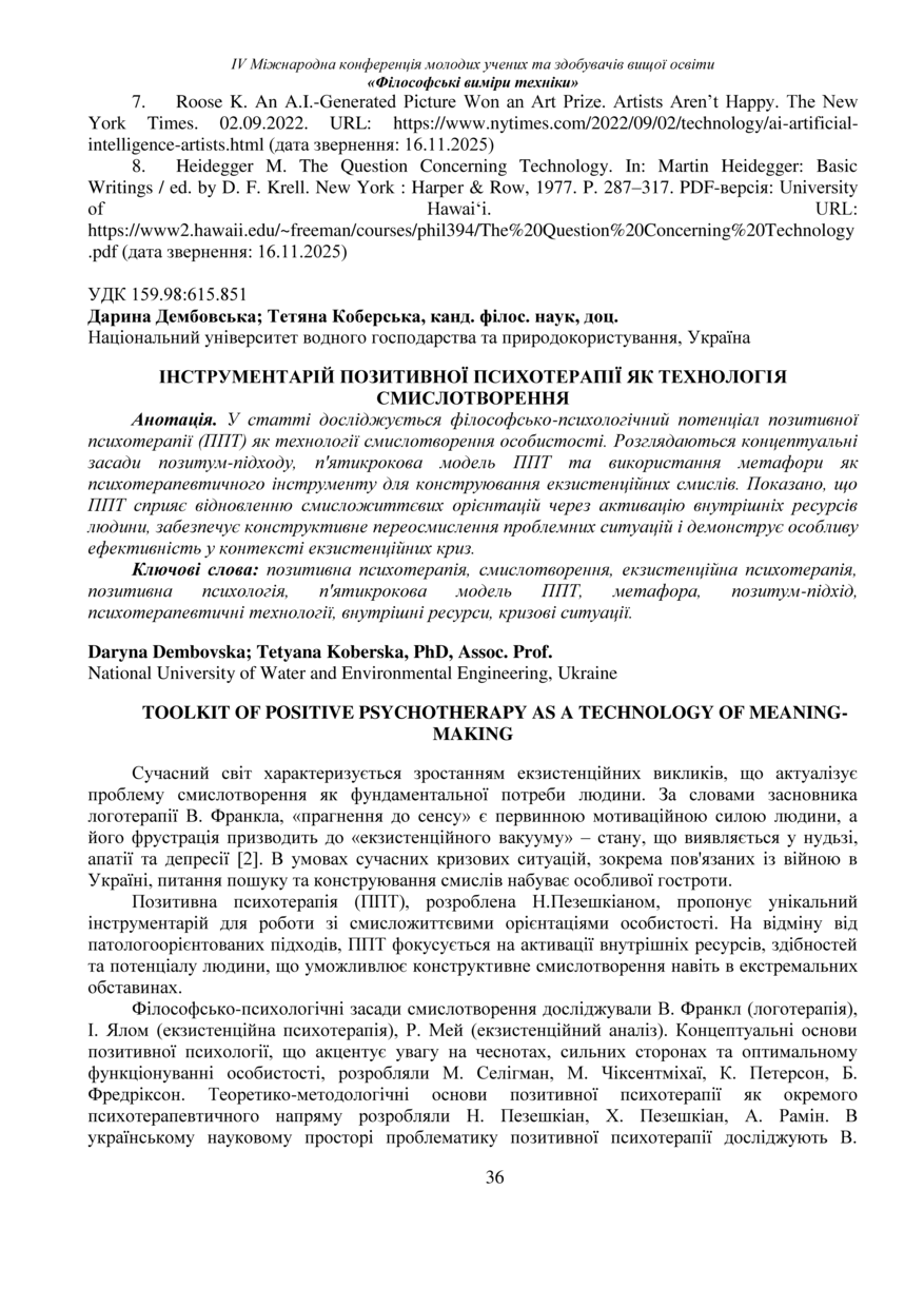 | Bibliographic citation (APA): | Dembovska, D., & Koberska, T. (2025). Instrumentarii pozytyvnoi psykhoterapii yak tekhnolohiia smyslotvorennia [Toolkit of positive psychotherapy as a technology of meaning-making]. Book of abstracts of the Ⅳ International Conference of Young Scholars and Higher Education Applicants „Philosophical dimensions of technology“, 26 November 2025, Ternopil, 36-38. PE Palianytsia V.A.. [in Ukrainian]. |