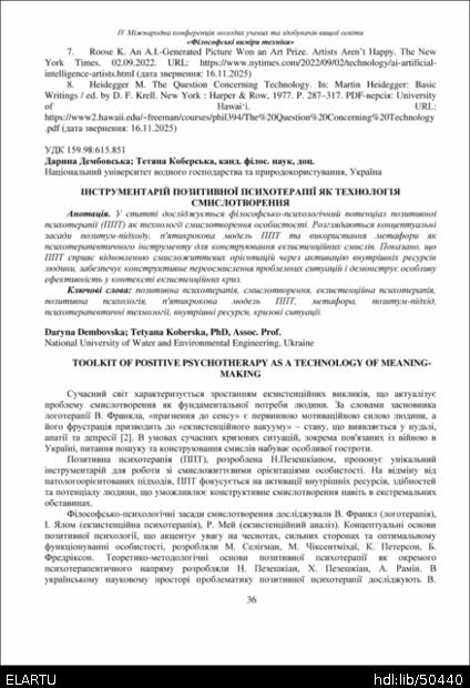 | Bibliographic reference (2015): | Дембовська Д., Коберська Т. Інструментарій позитивної психотерапії як технологія смислотворення // Матеріали Ⅳ Міжнародної конференції молодих учених та здобувачів вищої освіти „Філософські виміри техніки“, Тернопіль, 26 листопада 2025 р. 2025. С. 36–38. |