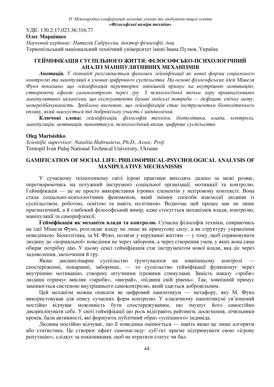| Bibliographic citation (CHICAGO): | Martsishko O. (2025) Heimifikatsiia suspilnoho zhyttia: filosofsko-psykholohichnyi analiz manipuliatyvnykh mekhanizmiv [Gamification of social life: philosophical-psychological analysis of manipulative mechanisms]. Book of abstracts of the Ⅳ International Conference of Young Scholars and Higher Education Applicants „Philosophical dimensions of technology“ (Tern., 26 November 2025), pp. 44-46 [in Ukrainian]. |