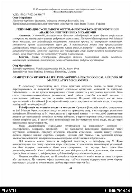 | Bibliographic citation (APA): | Martsishko, O. (2025). Heimifikatsiia suspilnoho zhyttia: filosofsko-psykholohichnyi analiz manipuliatyvnykh mekhanizmiv [Gamification of social life: philosophical-psychological analysis of manipulative mechanisms]. Book of abstracts of the Ⅳ International Conference of Young Scholars and Higher Education Applicants „Philosophical dimensions of technology“, 26 November 2025, Ternopil, 44-46. PE Palianytsia V.A.. [in Ukrainian]. |