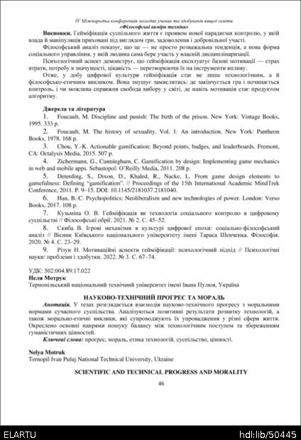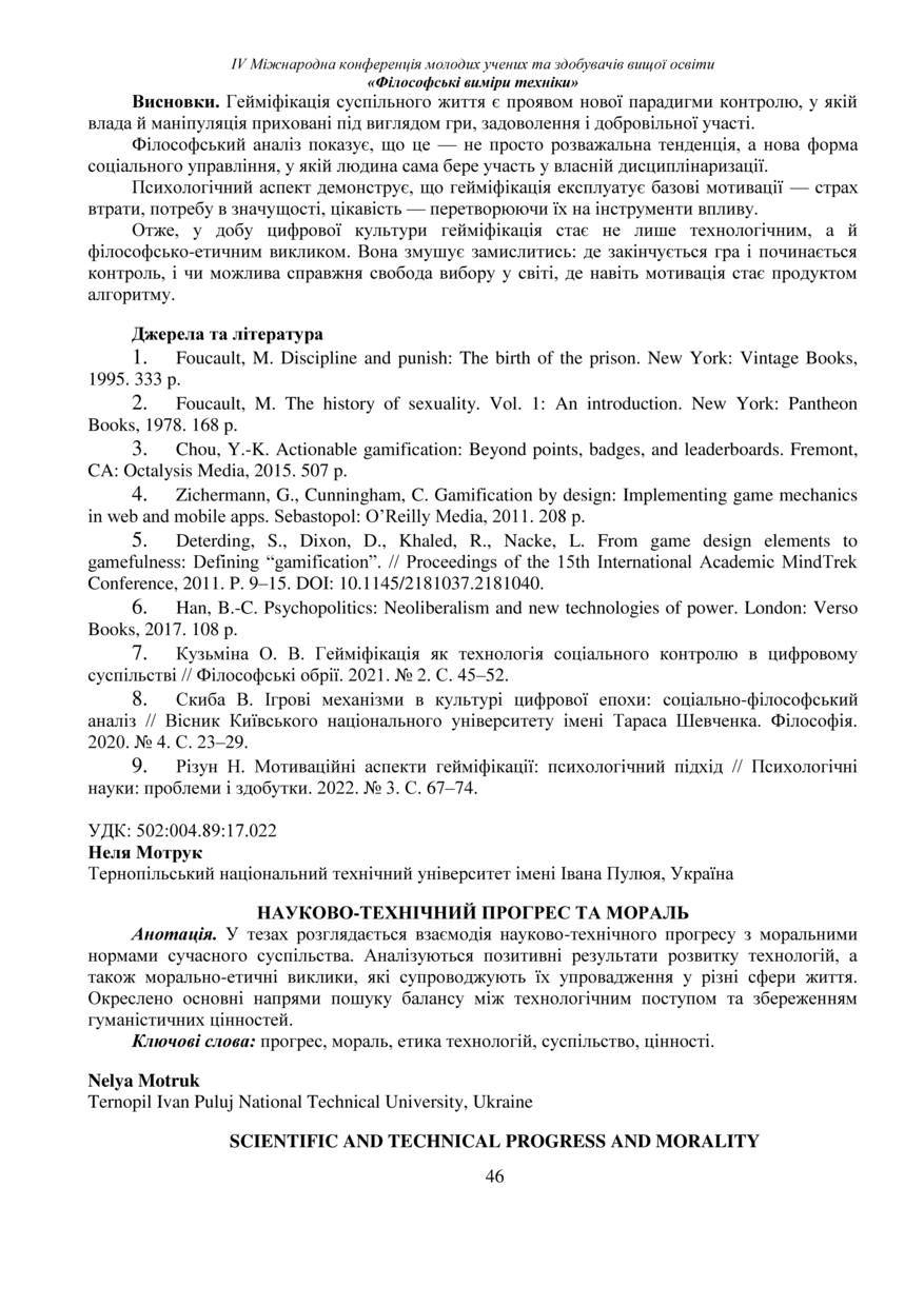 | Bibliographic reference (2015): | Мотрук Н. Науково-технічний прогрес та мораль // Матеріали Ⅳ Міжнародної конференції молодих учених та здобувачів вищої освіти „Філософські виміри техніки“, Тернопіль, 26 листопада 2025 р. 2025. С. 46–50. |