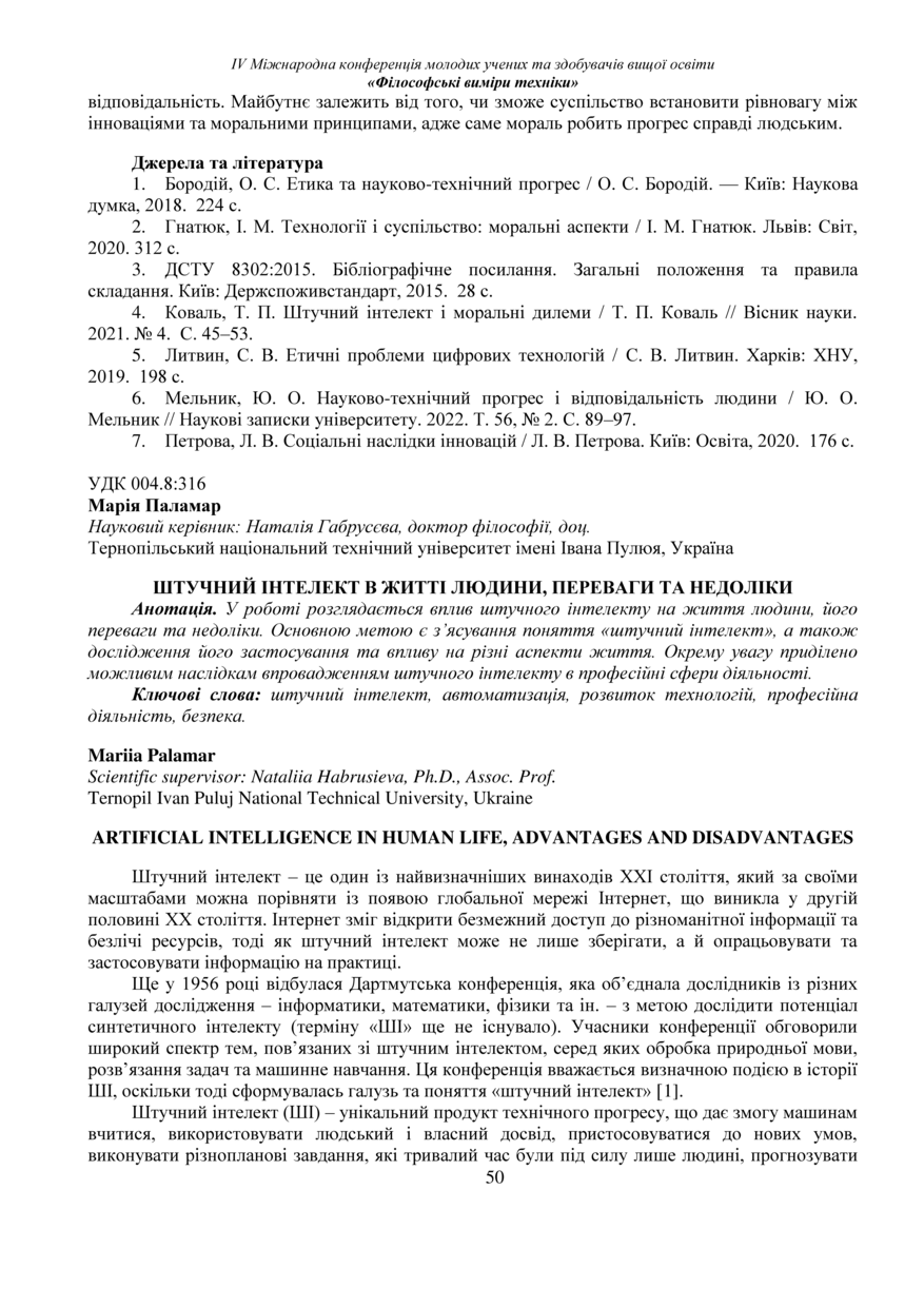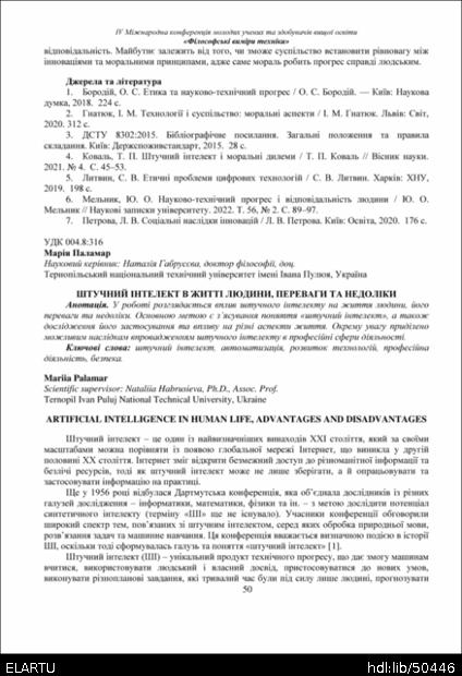 | Bibliographic citation (APA): | Palamar, M. (2025). Shtuchnyi intelekt v zhytti liudyny, perevahy ta nedoliky [Artificial intelligence in human life, advantages and disadvantages]. Book of abstracts of the Ⅳ International Conference of Young Scholars and Higher Education Applicants „Philosophical dimensions of technology“, 26 November 2025, Ternopil, 50-52. PE Palianytsia V.A.. [in Ukrainian]. |