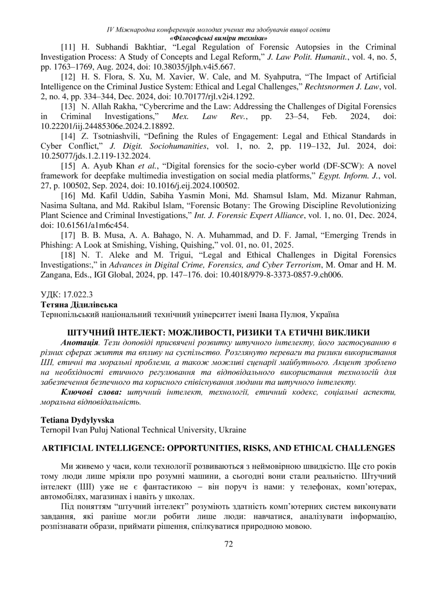 | Bibliographic citation (APA): | Dydylyvska, T. (2025). Shtuchnyi intelekt: mozhlyvosti, ryzyky ta etychni vyklyky [Artificial intelligence: opportunities, risks, and ethical challenges]. Book of abstracts of the Ⅳ International Conference of Young Scholars and Higher Education Applicants „Philosophical dimensions of technology“, 26 November 2025, Ternopil, 72-74. PE Palianytsia V.A.. [in Ukrainian]. |