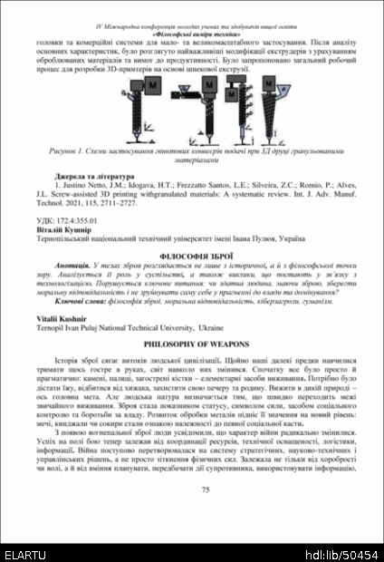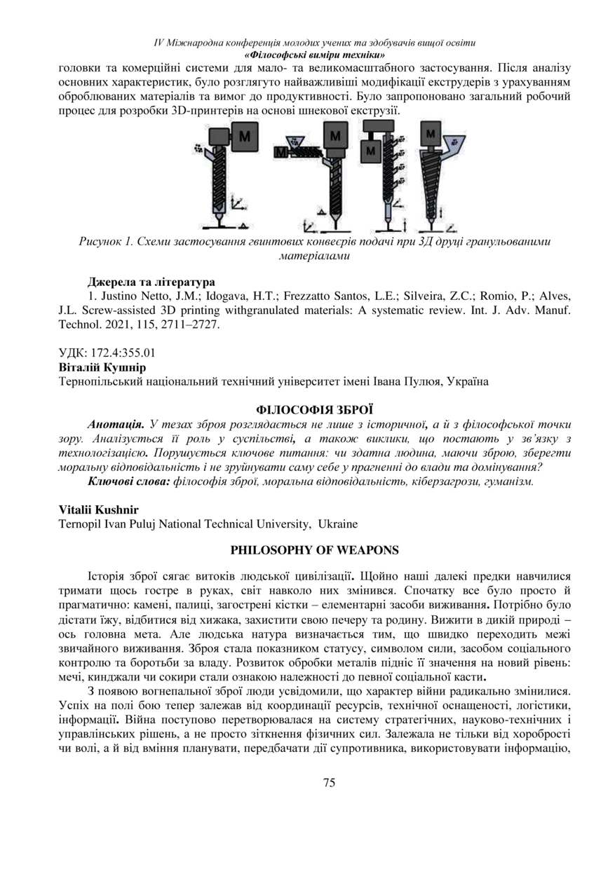 | Bibliographic reference (2015): | Кушнір В. Філософія зброї // Матеріали Ⅳ Міжнародної конференції молодих учених та здобувачів вищої освіти „Філософські виміри техніки“, Тернопіль, 26 листопада 2025 р. 2025. С. 75–77. |