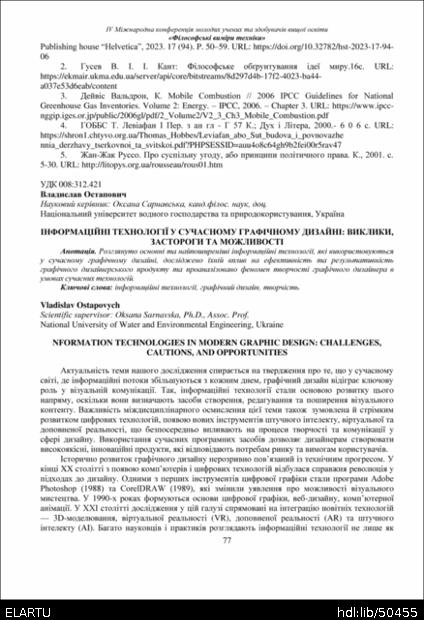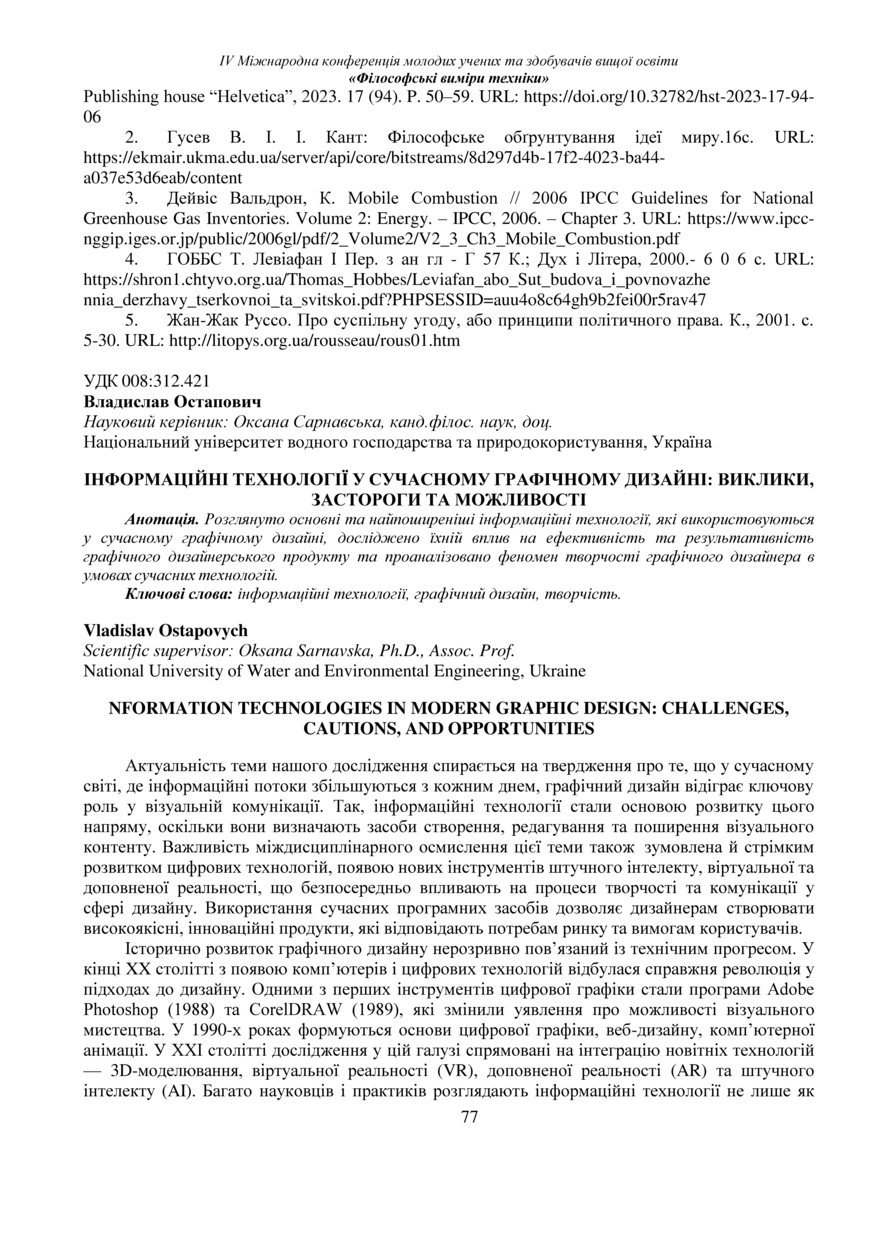 | Bibliographic citation (APA): | Ostapovych, V. (2025). Informatsiini tekhnolohii u suchasnomu hrafichnomu dyzaini: vyklyky, zastorohy ta mozhlyvosti [Nformation technologies in modern graphic design: challenges, cautions, and opportunities]. Book of abstracts of the Ⅳ International Conference of Young Scholars and Higher Education Applicants „Philosophical dimensions of technology“, 26 November 2025, Ternopil, 77-79. PE Palianytsia V.A.. [in Ukrainian]. |