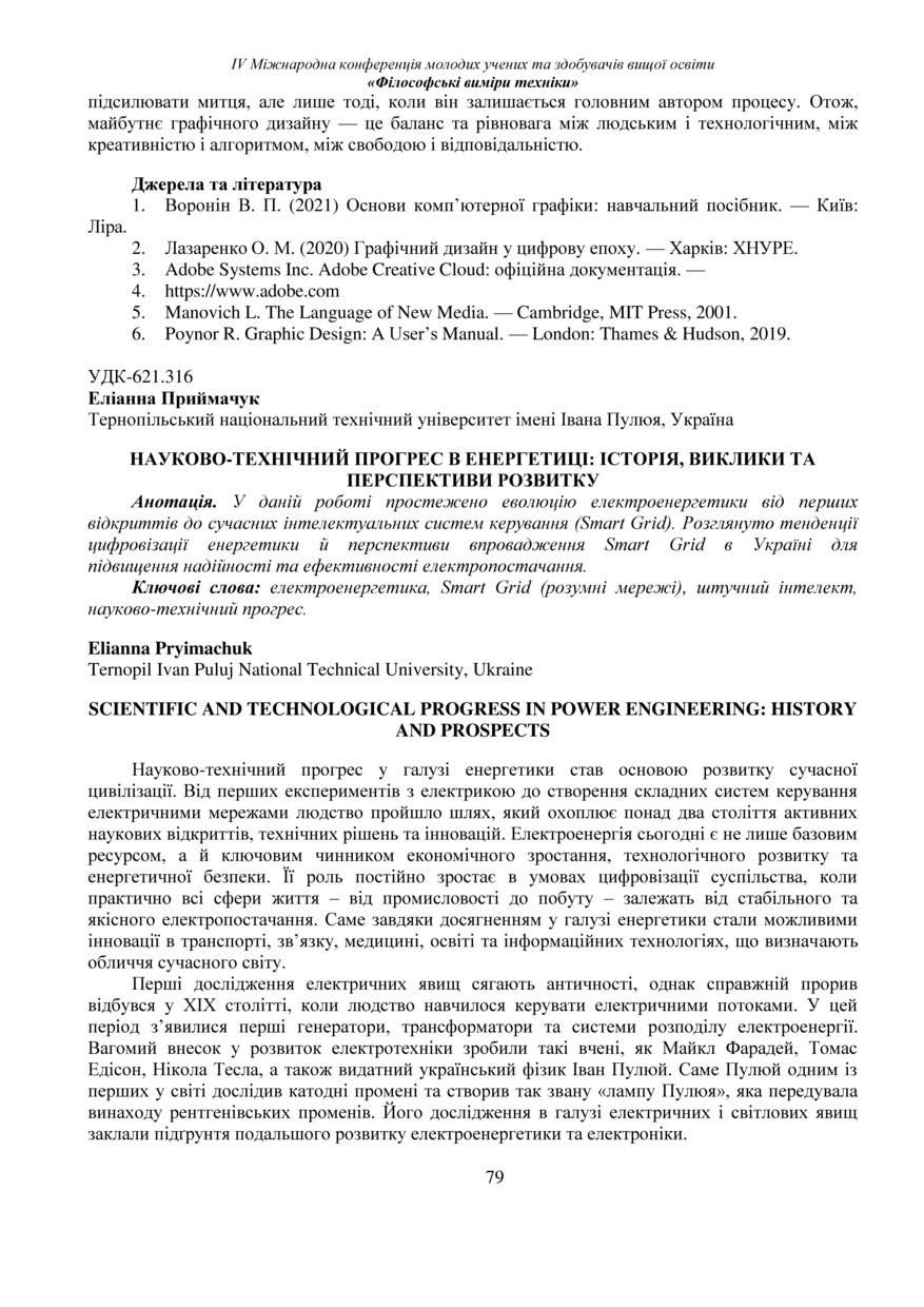| Bibliographic citation (APA): | Pryimachuk, E. (2025). Naukovo-tekhnichnyi prohres v enerhetytsi: istoriia, vyklyky ta perspektyvy rozvytku [Scientific and technological progress in power engineering: history and prospects]. Book of abstracts of the Ⅳ International Conference of Young Scholars and Higher Education Applicants „Philosophical dimensions of technology“, 26 November 2025, Ternopil, 79-82. PE Palianytsia V.A.. [in Ukrainian]. |