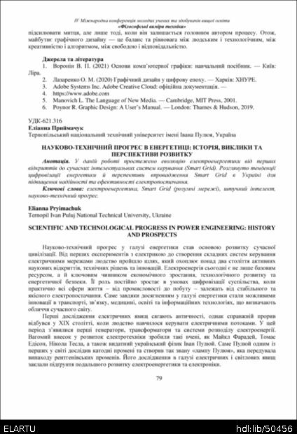| Bibliographic reference (2015): | Приймачук Е. Науково-технічний прогрес в енергетиці: історія, виклики та перспективи розвитку // Матеріали Ⅳ Міжнародної конференції молодих учених та здобувачів вищої освіти „Філософські виміри техніки“, Тернопіль, 26 листопада 2025 р. 2025. С. 79–82. |