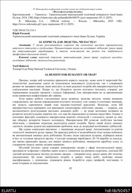| Bibliographic reference (2015): | Роговой Ю. AI: користь для людства, чи пастка? // Матеріали Ⅳ Міжнародної конференції молодих учених та здобувачів вищої освіти „Філософські виміри техніки“, Тернопіль, 26 листопада 2025 р. 2025. С. 82–83. |