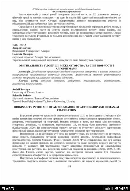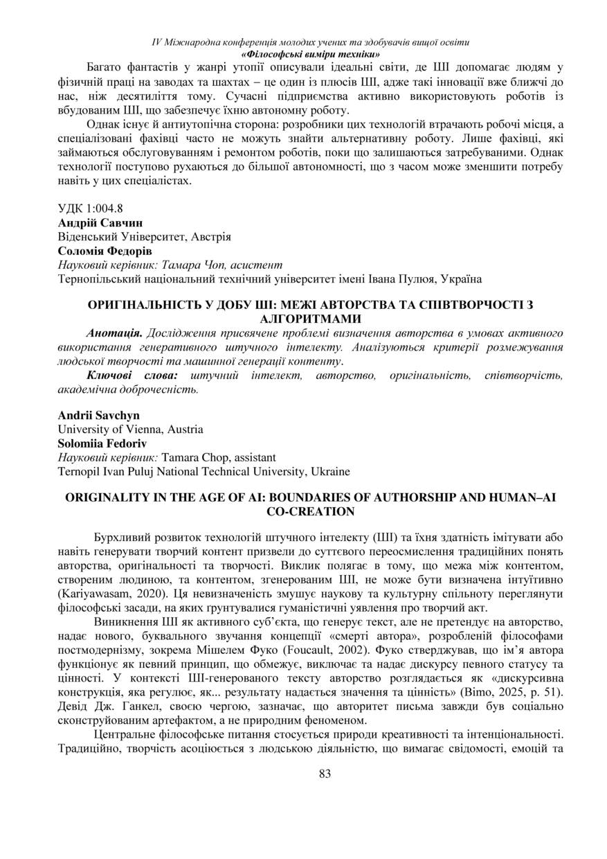 | Bibliographic citation (APA): | Savchyn, A., & Fedoriv, S. (2025). Oryhinalnist u dobu ShI: mezhi avtorstva ta spivtvorchosti z alhorytmamy [Originality in the age of AI: boundaries of authorship and human–ai co-creation]. Book of abstracts of the Ⅳ International Conference of Young Scholars and Higher Education Applicants „Philosophical dimensions of technology“, 26 November 2025, Ternopil, 83-85. PE Palianytsia V.A.. [in Ukrainian]. |