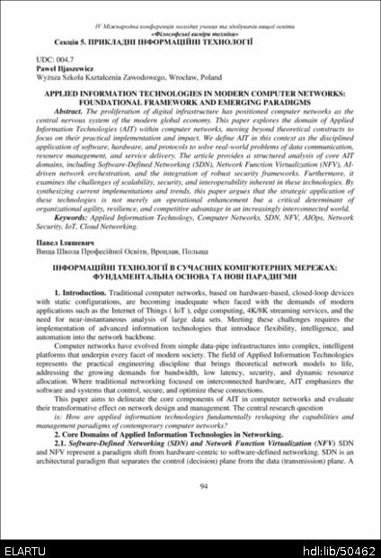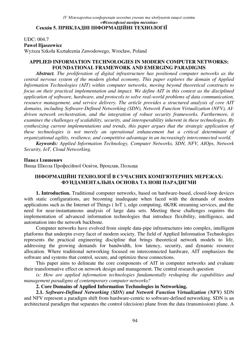 | Bibliographic citation (APA): | Iljaszewicz, P. (2025). Applied information technologies in modern computer networks: foundational framework and emerging paradigms. Book of abstracts of the Ⅳ International Conference of Young Scholars and Higher Education Applicants „Philosophical dimensions of technology“, 26 November 2025, Ternopil, 94-101. PE Palianytsia V.A... |