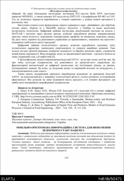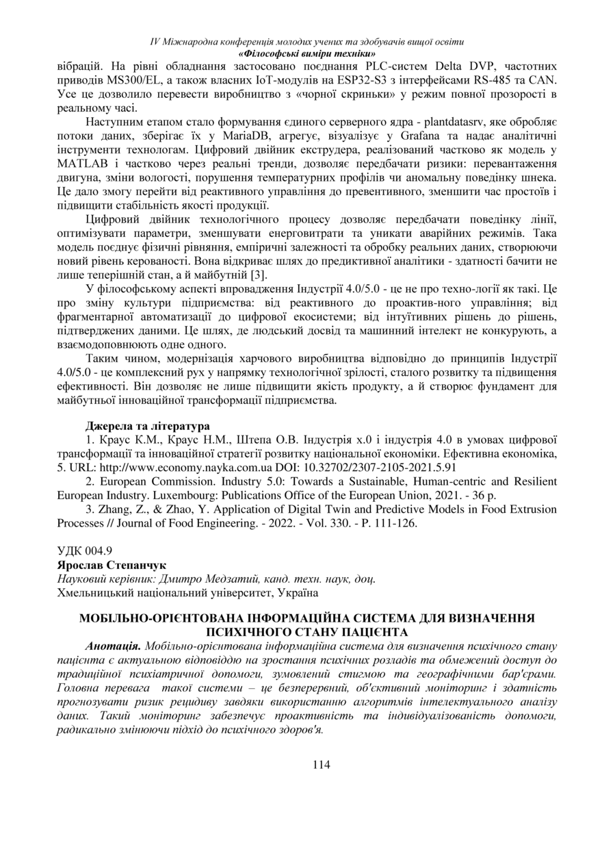 | Bibliographic reference (2015): | Степанчук Я. Мобільно-орієнтована інформаційна система для визначення психічного стану пацієнта // Матеріали Ⅳ Міжнародної конференції молодих учених та здобувачів вищої освіти „Філософські виміри техніки“, Тернопіль, 26 листопада 2025 р. 2025. С. 114–116. |