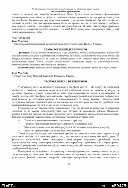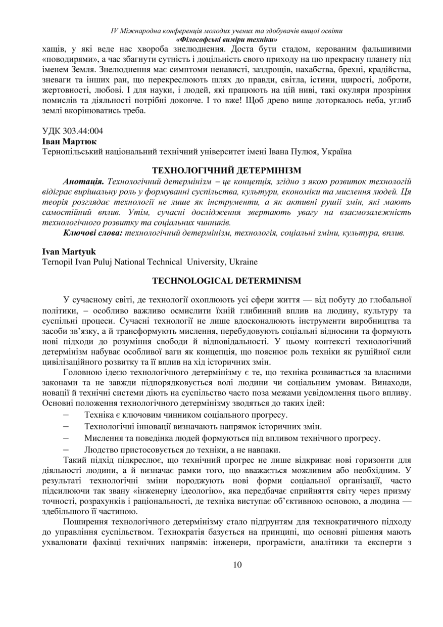 | Bibliographic reference (2015): | Мартюк І. Технологічний детермінізм // Матеріали Ⅳ Міжнародної конференції молодих учених та здобувачів вищої освіти „Філософські виміри техніки“, Тернопіль, 26 листопада 2025 р. 2025. С. 10–12. |