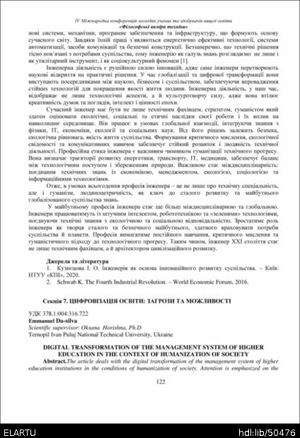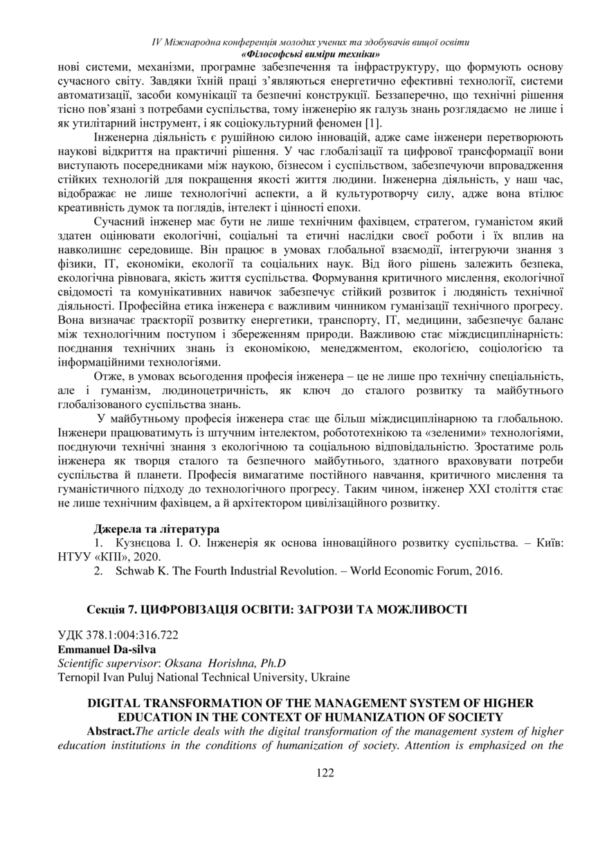 Bibliographic citation (CHICAGO): Da-silva E. (2025) Digital transformation of the management system of higher education in the context of humanization of society. Book of abstracts of the Ⅳ International Conference of Young Scholars and Higher Education Applicants „Philosophical dimensions of technology“ (Tern., 26 November 2025), pp. 122-124.