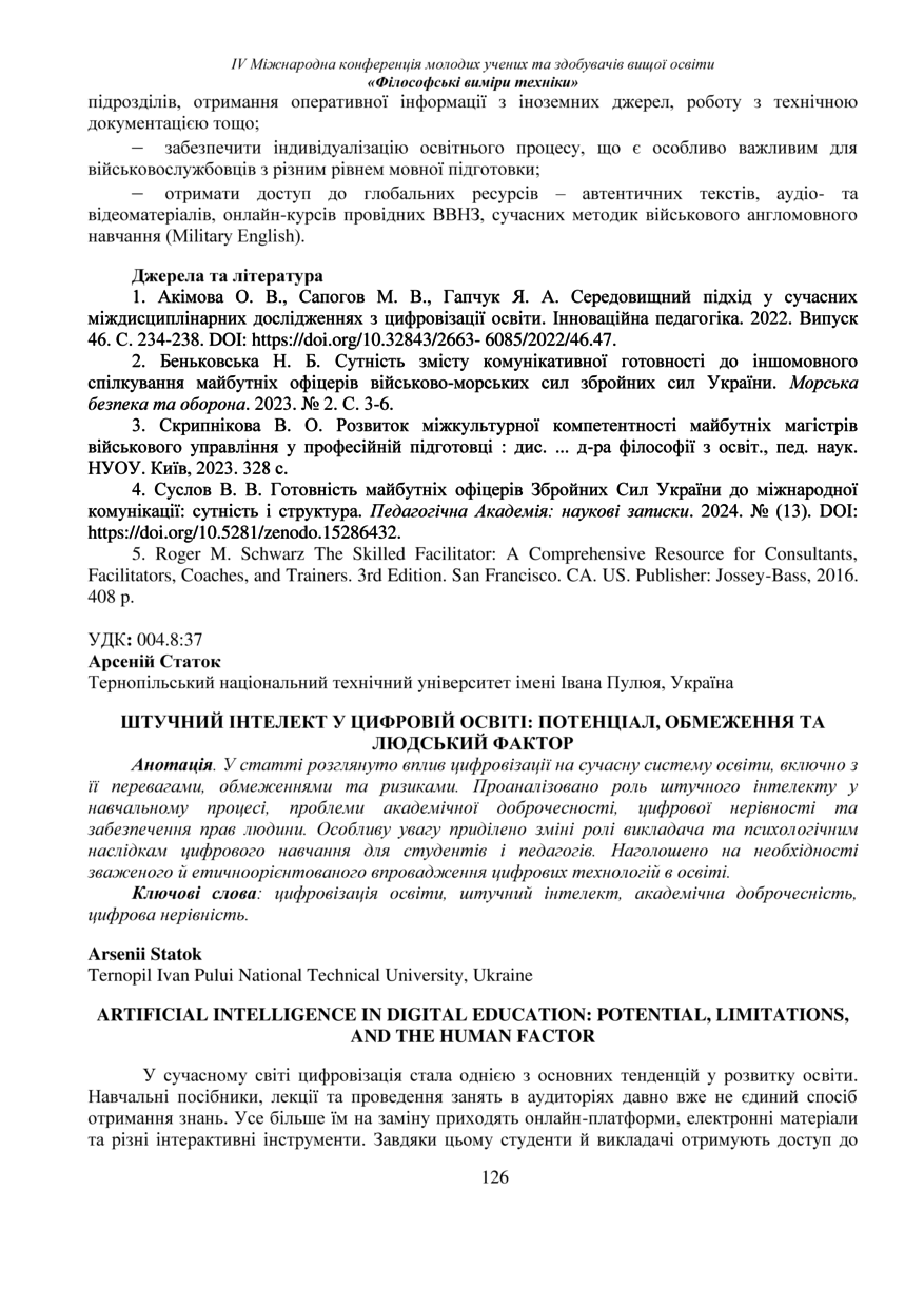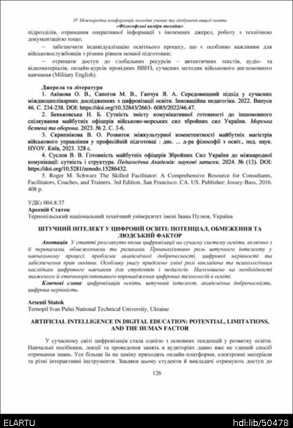 | Bibliographic citation (APA): | Statok, A. (2025). Shtuchnyi intelekt u tsyfrovii osviti: potentsial, obmezhennia ta liudskyi faktor [Artificial intelligence in digital education: potential, limitations, and the human factor]. Book of abstracts of the Ⅳ International Conference of Young Scholars and Higher Education Applicants „Philosophical dimensions of technology“, 26 November 2025, Ternopil, 126-128. PE Palianytsia V.A.. [in Ukrainian]. |
