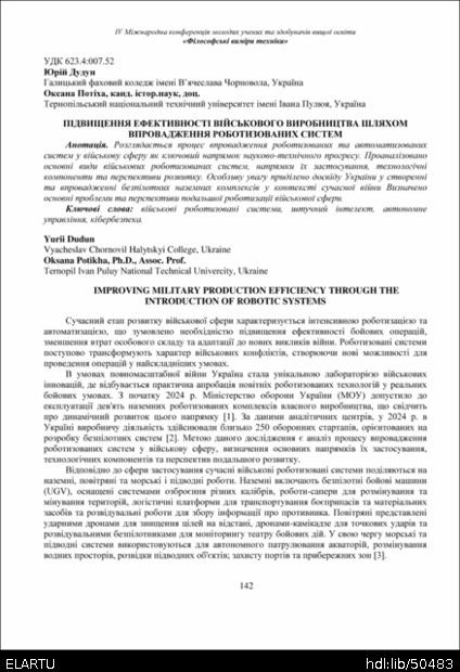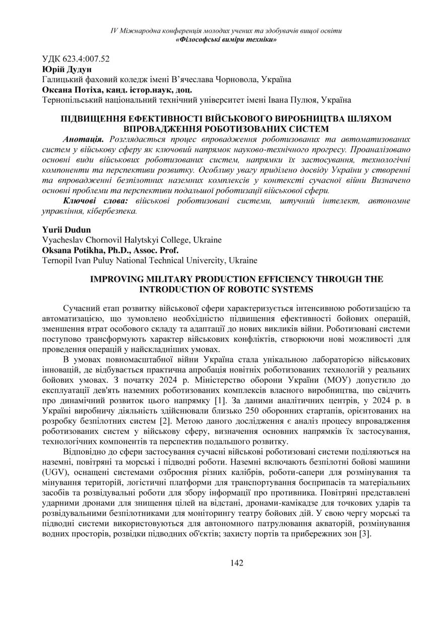 | Bibliographic citation (APA): | Dudun, Y. (2025). Pidvyshchennia efektyvnosti viiskovoho vyrobnytstva shliakhom vprovadzhennia robotyzovanykh system [Improving military production efficiency through the introduction of robotic systems]. Book of abstracts of the Ⅳ International Conference of Young Scholars and Higher Education Applicants „Philosophical dimensions of technology“, 26 November 2025, Ternopil, 142-145. PE Palianytsia V.A.. [in Ukrainian]. |