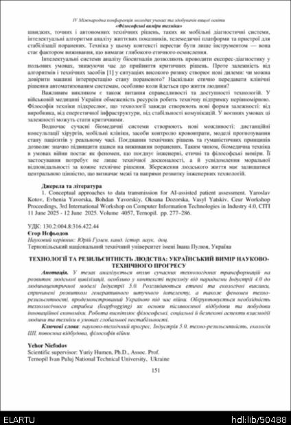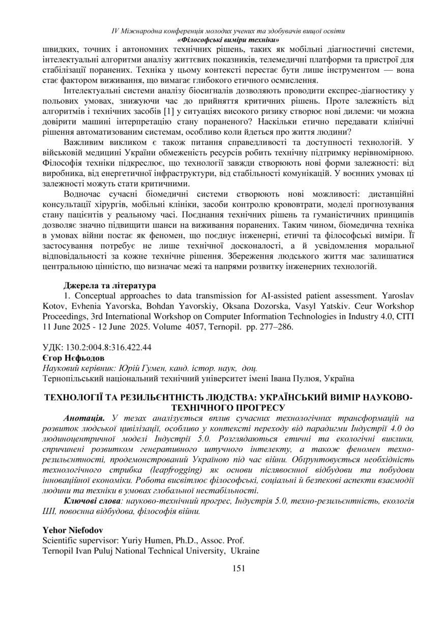 | Bibliographic citation (APA): | Niefodov, Y. (2025). Tekhnolohii ta rezylientnist liudstva: ukrainskyi vymir naukovo-tekhnichnoho prohresu [Technologies and human resilience: the ukrainian perspective on scientific and technological progress]. Book of abstracts of the Ⅳ International Conference of Young Scholars and Higher Education Applicants „Philosophical dimensions of technology“, 26 November 2025, Ternopil, 151-153. PE Palianytsia V.A.. [in Ukrainian]. |