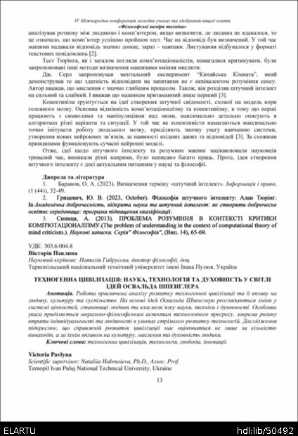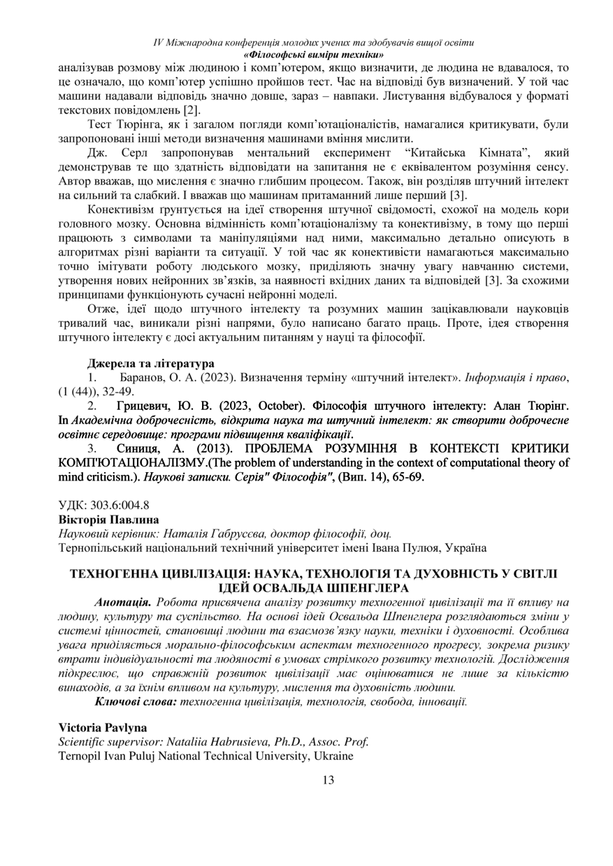 | Bibliographic citation (APA): | Pavlyna, V. (2025). Tekhnohenna tsyvilizatsiia: nauka, tekhnolohiia ta dukhovnist u svitli idei Osvalda Shpenhlera [Technogenic civilization: science, technology, and spirituality in the context of Oswald Spengler’s thought]. Book of abstracts of the Ⅳ International Conference of Young Scholars and Higher Education Applicants „Philosophical dimensions of technology“, 26 November 2025, Ternopil, 13-15. PE Palianytsia V.A.. [in Ukrainian]. |