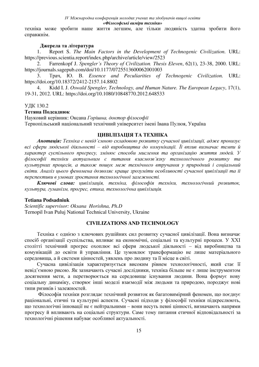 | Bibliographic reference (2015): | Подсаднюк Т. Цивілізація та техніка // Матеріали Ⅳ Міжнародної конференції молодих учених та здобувачів вищої освіти „Філософські виміри техніки“, Тернопіль, 26 листопада 2025 р. 2025. С. 15–16. |