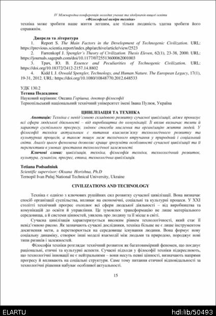 | Bibliographic citation (APA): | Podsadniuk, T. (2025). Tsyvilizatsiia ta tekhnika [Civilizations and technology]. Book of abstracts of the Ⅳ International Conference of Young Scholars and Higher Education Applicants „Philosophical dimensions of technology“, 26 November 2025, Ternopil, 15-16. PE Palianytsia V.A.. [in Ukrainian]. |