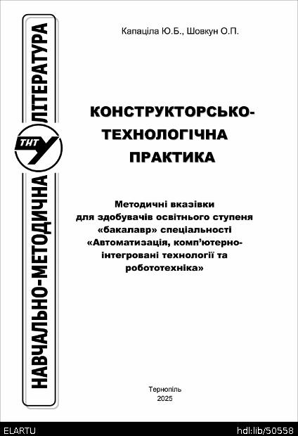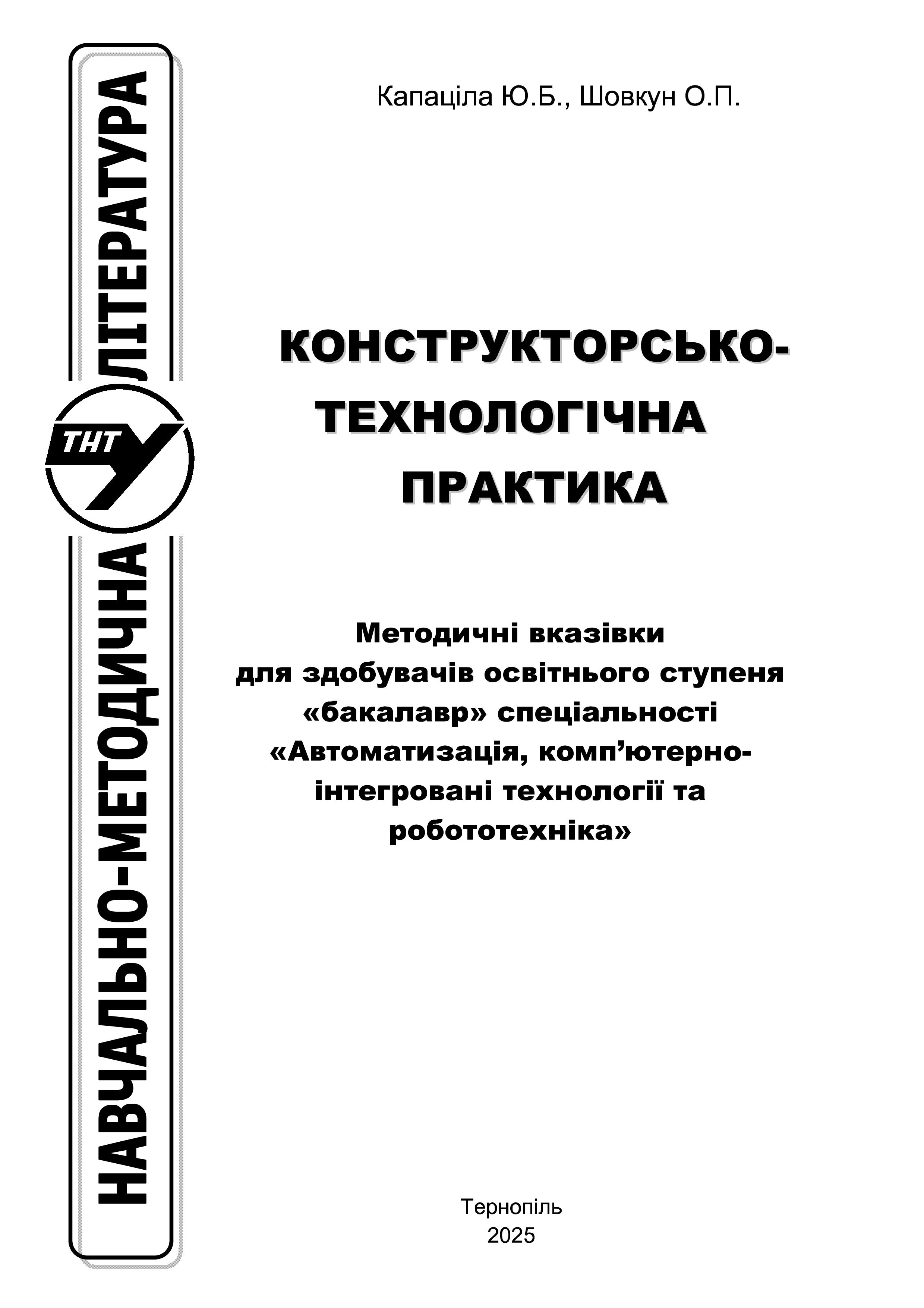 | Bibliographic reference (2015): | Капаціла Ю.Б., Шовкун О.П. Конструкторсько-технологічна практика. Методичні вказівки для здобувачів освітнього ступеня «бакалавр» спеціальності «Автоматизація, комп’ютерно-інтегровані технології та робототехніка». Тернопіль.: Видавництво ТНТУ. 2025. 22 с. |
