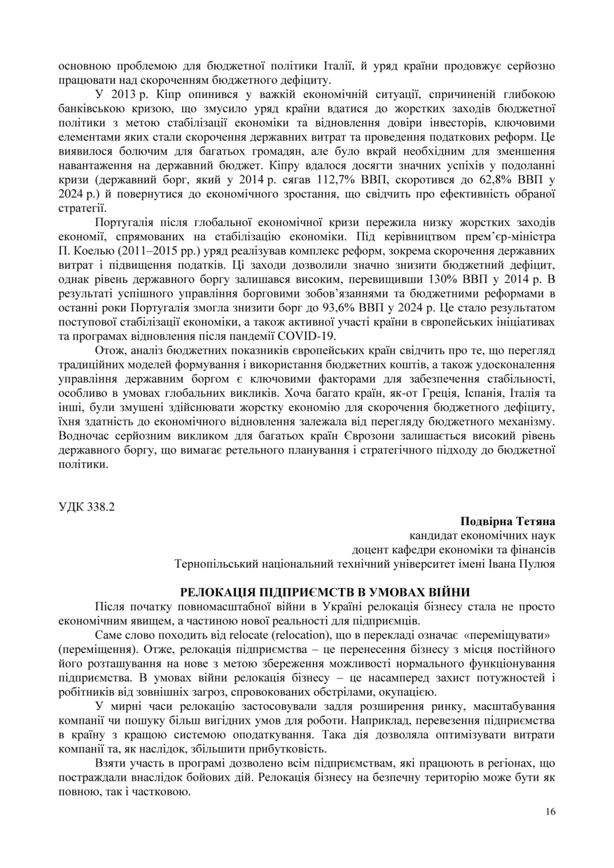 Bibliographic citation (CHICAGO): Podvirna T. V. (2025) Relokatsiia pidpryiemstv v umovakh viiny. Proceedings of the 15 International Scientific-Practical Conference “Formation of the mechanism of national economic systems competitive positions strengthening in global, regional and local dimensions” (Tern., 17 November 2025), pp. 16-18 [in Ukrainian].