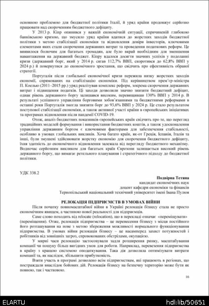 Бібліографічний опис: Подвірна Т. В. Релокація підприємств в умовах війни / Подвірна Тетяна Володимирівна // Матеріали ⅩⅤ Міжнародної науково-практичної конференції „Формування механізму зміцнення конкурентних позицій національних економічних систем у глобальному, регіональному та локальному вимірах“, 17 листопада 2025 року. — Т. : ФОП Паляниця В. А., 2025. — С. 16–18. — (Розвиток соціально-економічних систем мікро-, мезо- і макрорівня: конфлікт традиційних моделей та економічних реалій XXI століття).