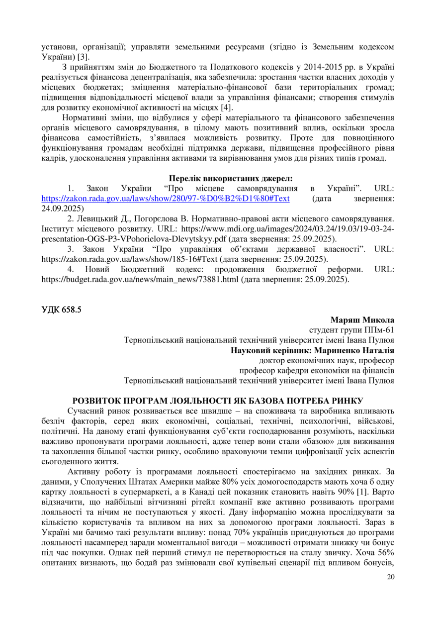 | Bibliographic citation (APA): | Mariash, M. (2025). Rozvytok prohram loialnosti yak bazova potreba rynku. Proceedings of the 15 International Scientific-Practical Conference “Formation of the mechanism of national economic systems competitive positions strengthening in global, regional and local dimensions”, 17 November 2025, Ternopil, 20-21. PE Palianytsia V. A.. [in Ukrainian]. |