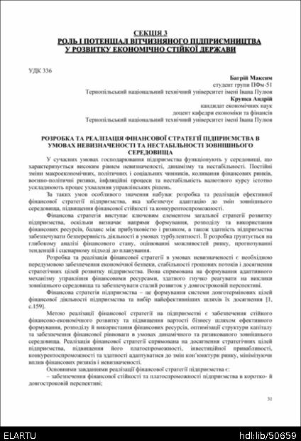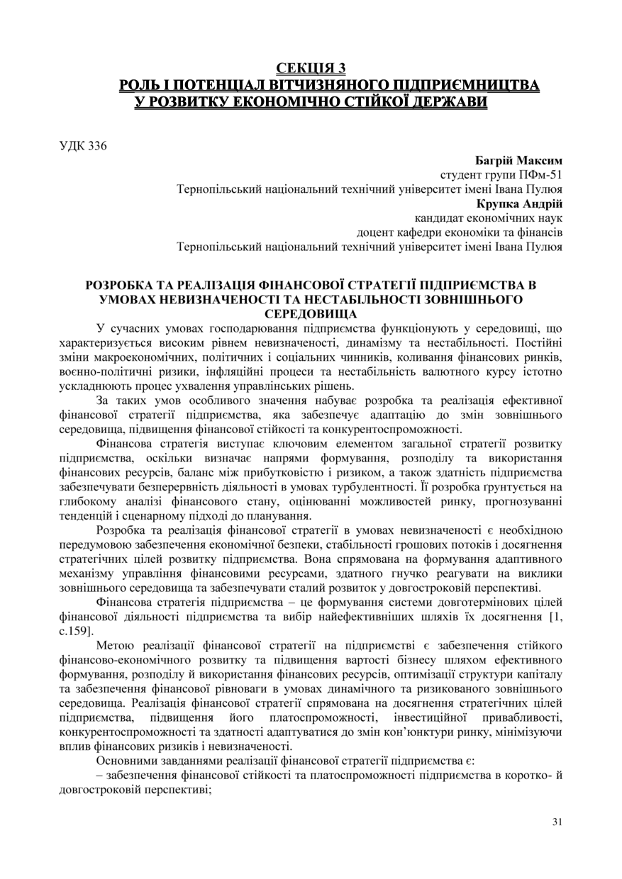 | Bibliographic citation (APA): | Bahrii, M., & Krupka, A. Ia. (2025). Rozrobka ta realizatsiia finansovoi stratehii pidpryiemstva v umovakh nevyznachenosti ta nestabilnosti zovnishnoho seredovyshcha. Proceedings of the 15 International Scientific-Practical Conference “Formation of the mechanism of national economic systems competitive positions strengthening in global, regional and local dimensions”, 17 November 2025, Ternopil, 31-33. PE Palianytsia V. A.. [in Ukrainian]. |
