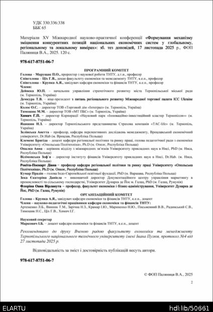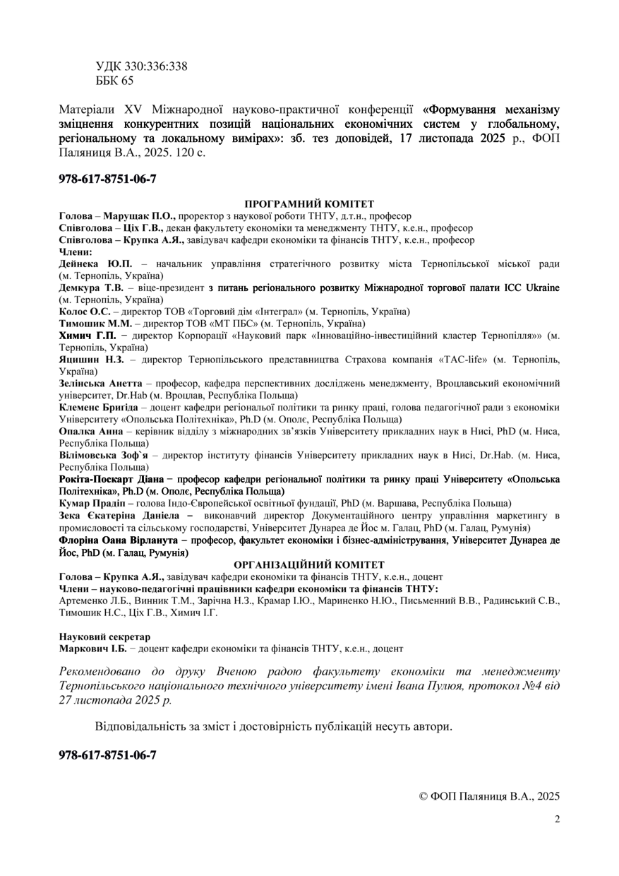 | Bibliographic citation (APA): | Redaktsiina storinka [Editorial page]. Proceedings of the 15 International Scientific-Practical Conference “Formation of the mechanism of national economic systems competitive positions strengthening in global, regional and local dimensions”, 17 November 2025, Ternopil, 2. PE Palianytsia V. A.. [in Ukrainian]. |