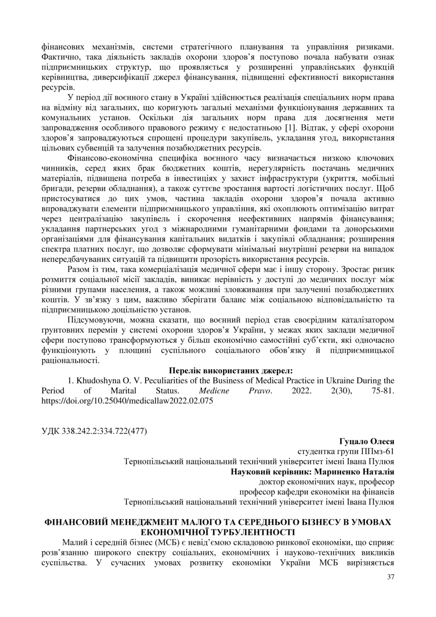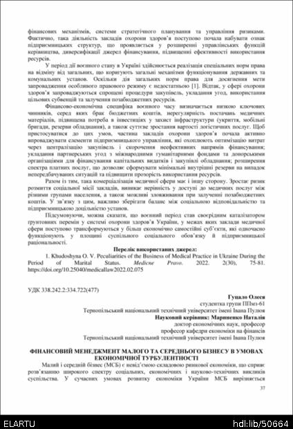 | Bibliographic citation (APA): | Hutsalo, O. (2025). Finansovyi menedzhment maloho ta serednoho biznesu v umovakh ekonomichnoi turbulentnosti. Proceedings of the 15 International Scientific-Practical Conference “Formation of the mechanism of national economic systems competitive positions strengthening in global, regional and local dimensions”, 17 November 2025, Ternopil, 37-40. PE Palianytsia V. A.. [in Ukrainian]. |