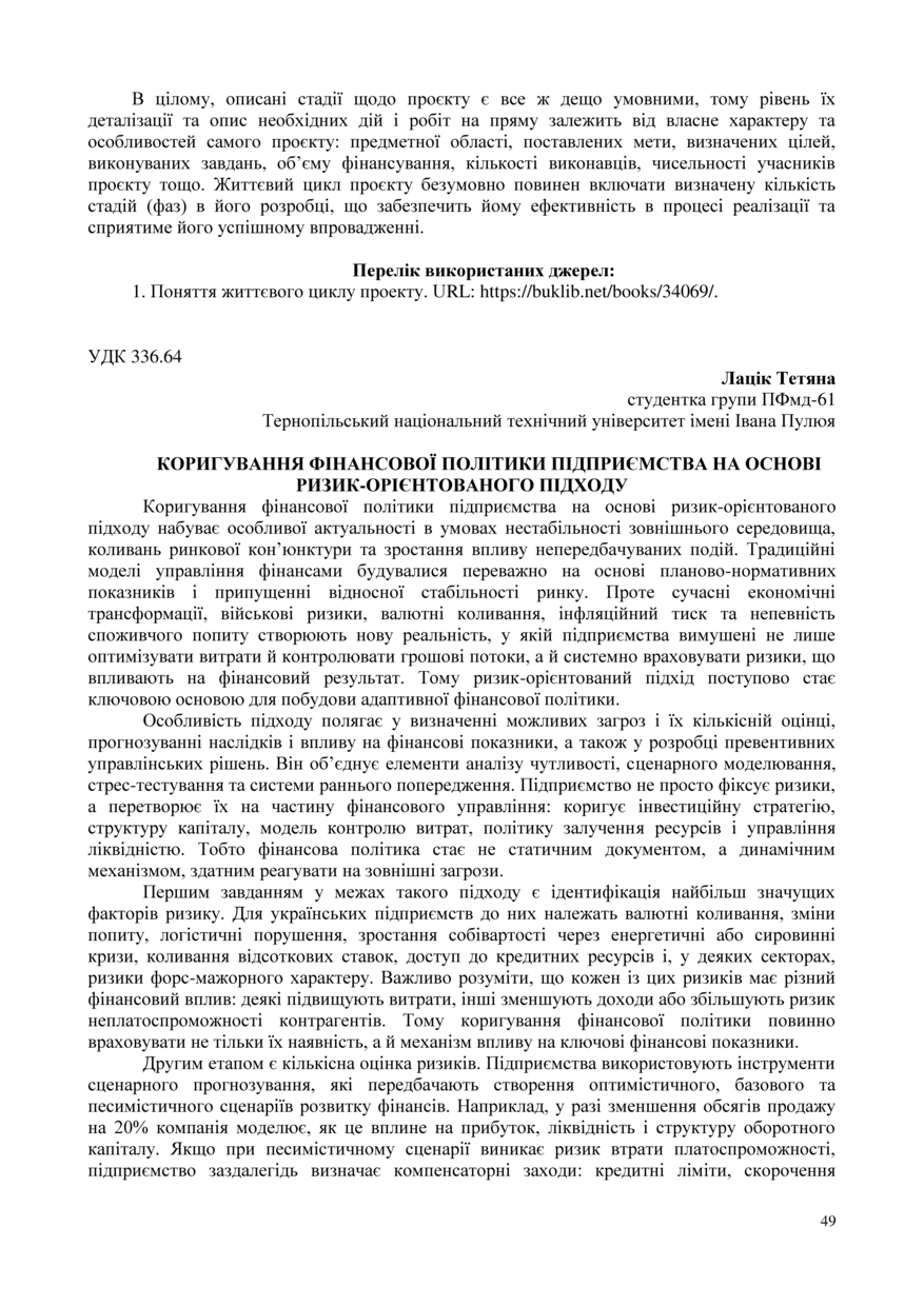 Бібліографічний опис: Лацік Т. Коригування фінансової політики підприємства на основі ризик-орієнтованого підходу / Лацік Тетяна // Матеріали ⅩⅤ Міжнародної науково-практичної конференції „Формування механізму зміцнення конкурентних позицій національних економічних систем у глобальному, регіональному та локальному вимірах“, 17 листопада 2025 року. — Т. : ФОП Паляниця В. А., 2025. — С. 49–50. — (Роль і потенціал вітчизняного підприємництва у розвитку економічно стійкої держави).