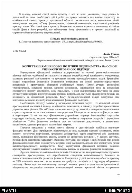 Bibliographic citation (APA): Latsik, T. (2025). Koryhuvannia finansovoi polityky pidpryiemstva na osnovi ryzyk-oriientovanoho pidkhodu. Proceedings of the 15 International Scientific-Practical Conference “Formation of the mechanism of national economic systems competitive positions strengthening in global, regional and local dimensions”, 17 November 2025, Ternopil, 49-50. PE Palianytsia V. A.. [in Ukrainian].