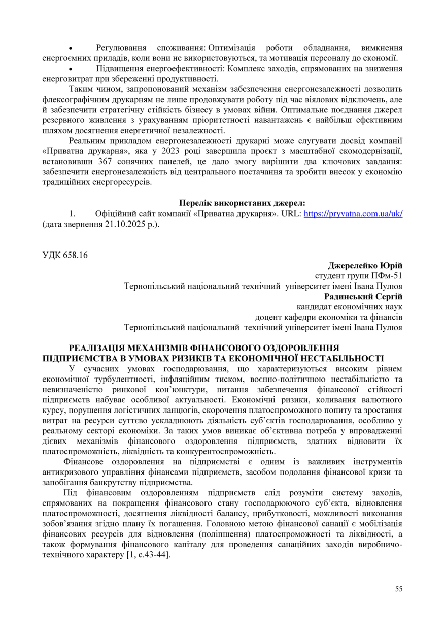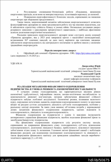 | Bibliographic citation (APA): | Dzhereleiko, Iu., & Radinskii, S. V. (2025). Realizatsiia mekhanizmiv finansovoho ozdorovlennia pidpryiemstva v umovakh ryzykiv ta ekonomichnoi nestabilnosti. Proceedings of the 15 International Scientific-Practical Conference “Formation of the mechanism of national economic systems competitive positions strengthening in global, regional and local dimensions”, 17 November 2025, Ternopil, 55-57. PE Palianytsia V. A.. [in Ukrainian]. |