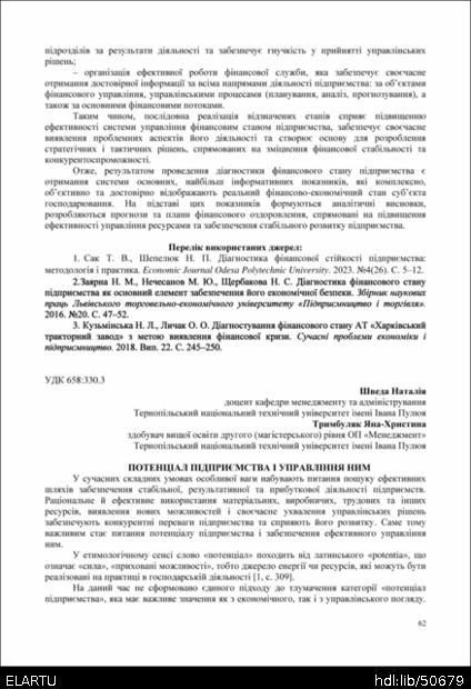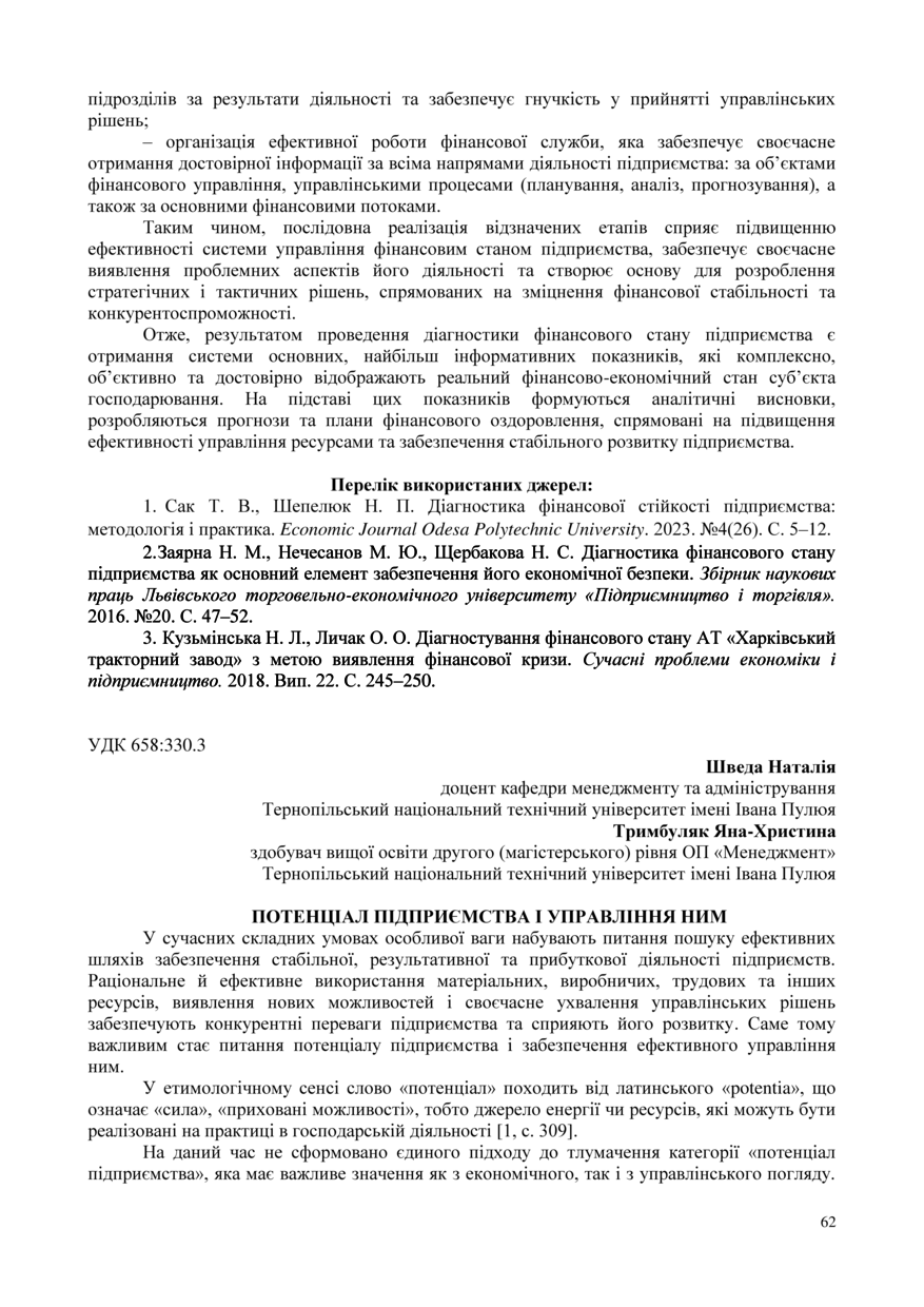 | Bibliographic citation (APA): | Shveda, N. M., & Trimbuliak, Ia. (2025). Potentsial pidpryiemstva i upravlinnia nym. Proceedings of the 15 International Scientific-Practical Conference “Formation of the mechanism of national economic systems competitive positions strengthening in global, regional and local dimensions”, 17 November 2025, Ternopil, 62-64. PE Palianytsia V. A.. [in Ukrainian]. |