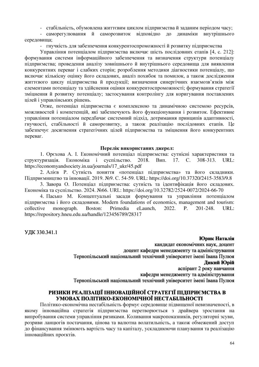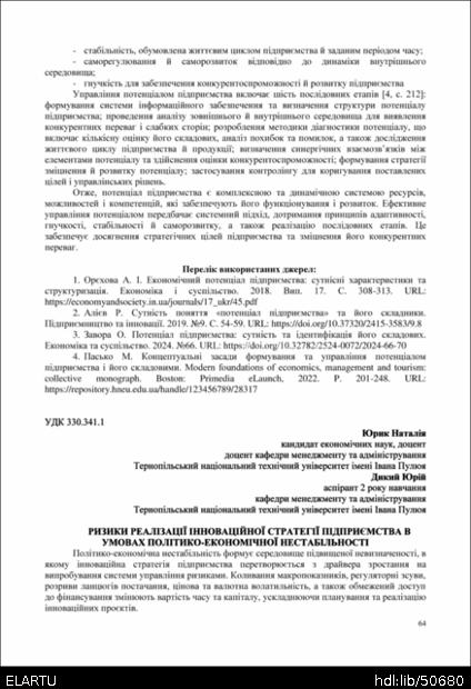 | Bibliographic citation (APA): | Yuryk, N. Ye., & Dikii, Iu. (2025). Ryzyky realizatsii innovatsiinoi stratehii pidpryiemstva v umovakh polityko-ekonomichnoi nestabilnosti. Proceedings of the 15 International Scientific-Practical Conference “Formation of the mechanism of national economic systems competitive positions strengthening in global, regional and local dimensions”, 17 November 2025, Ternopil, 64-66. PE Palianytsia V. A.. [in Ukrainian]. |
